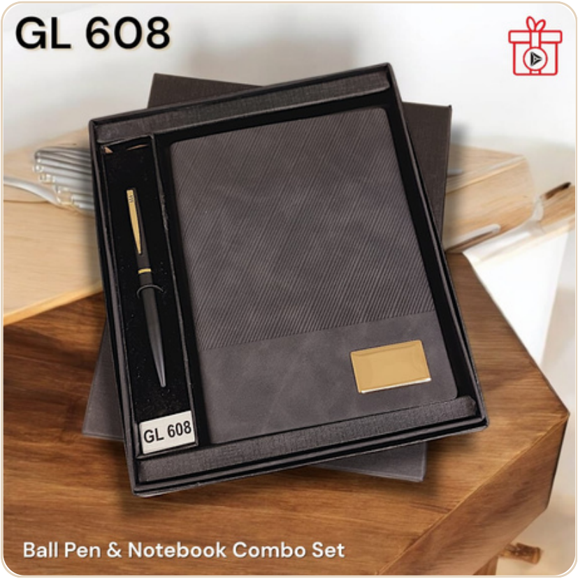 This elegant combo set includes a premium ball pen and a sophisticated notebook, perfect for professional use or as a thoughtful gift. The notebook features a textured cover and a sleek design, complemented by a stylish pen with a gold accent.