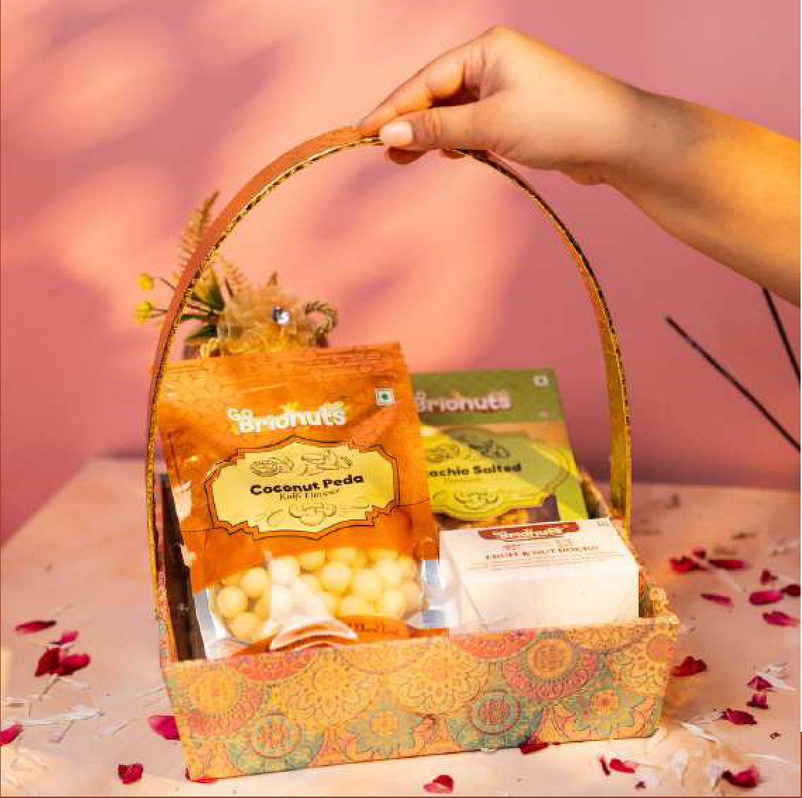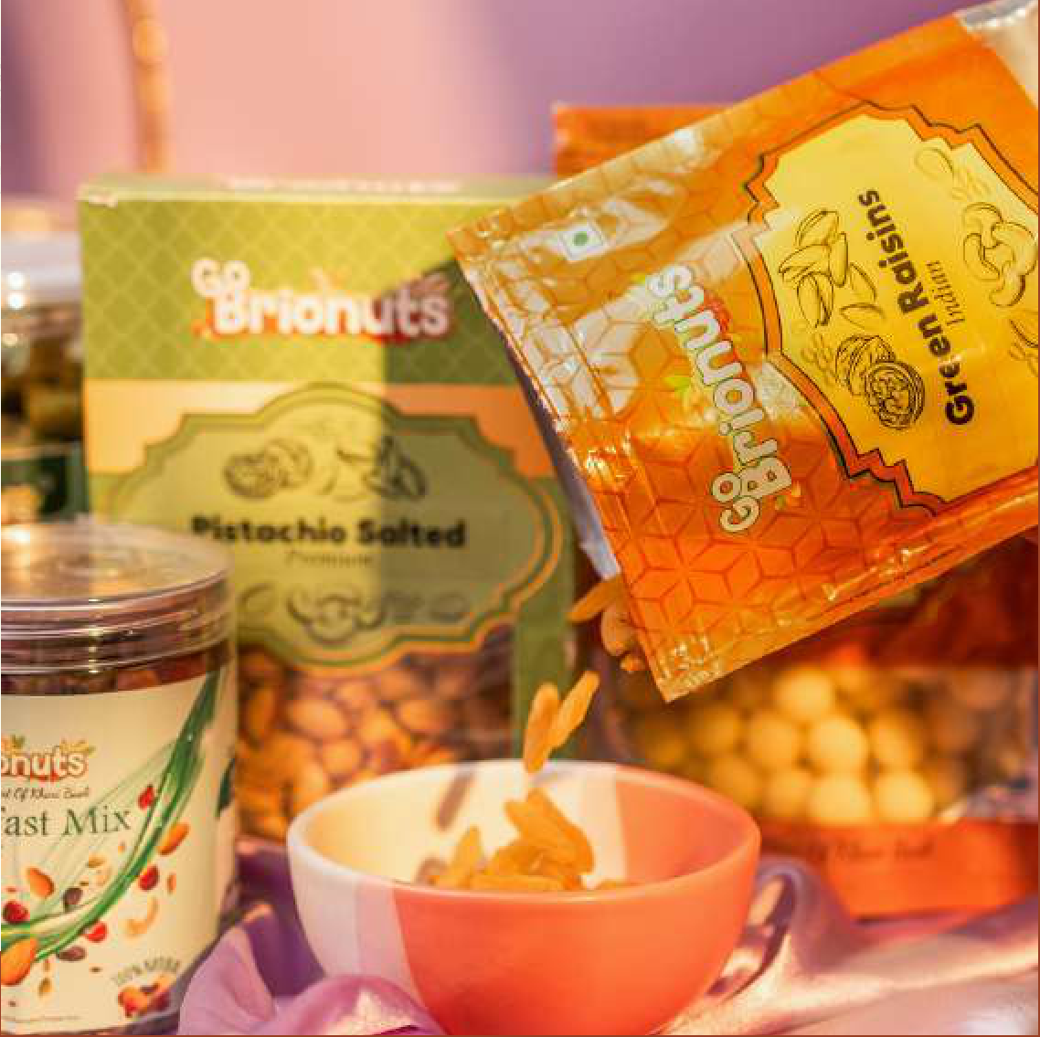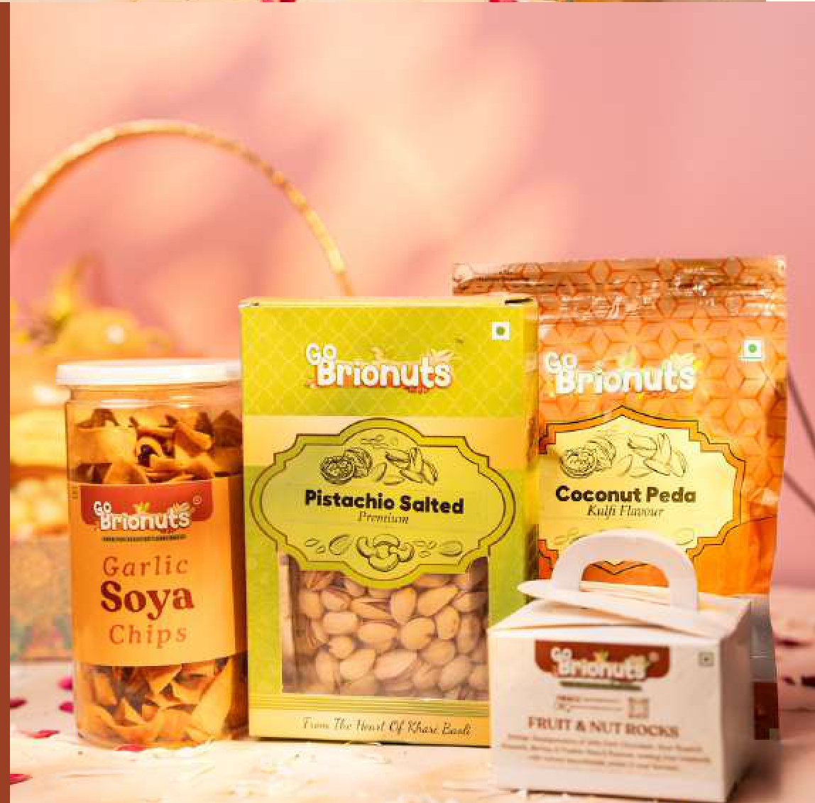 A curated selection of Go Brionuts' finest snacks, featuring Garlic Soya Chips, Pistachio Salted, Coconut Peda Kulfi Flavour, and Fruit & Nut Rocks. Perfect for a delightful snacking experience.