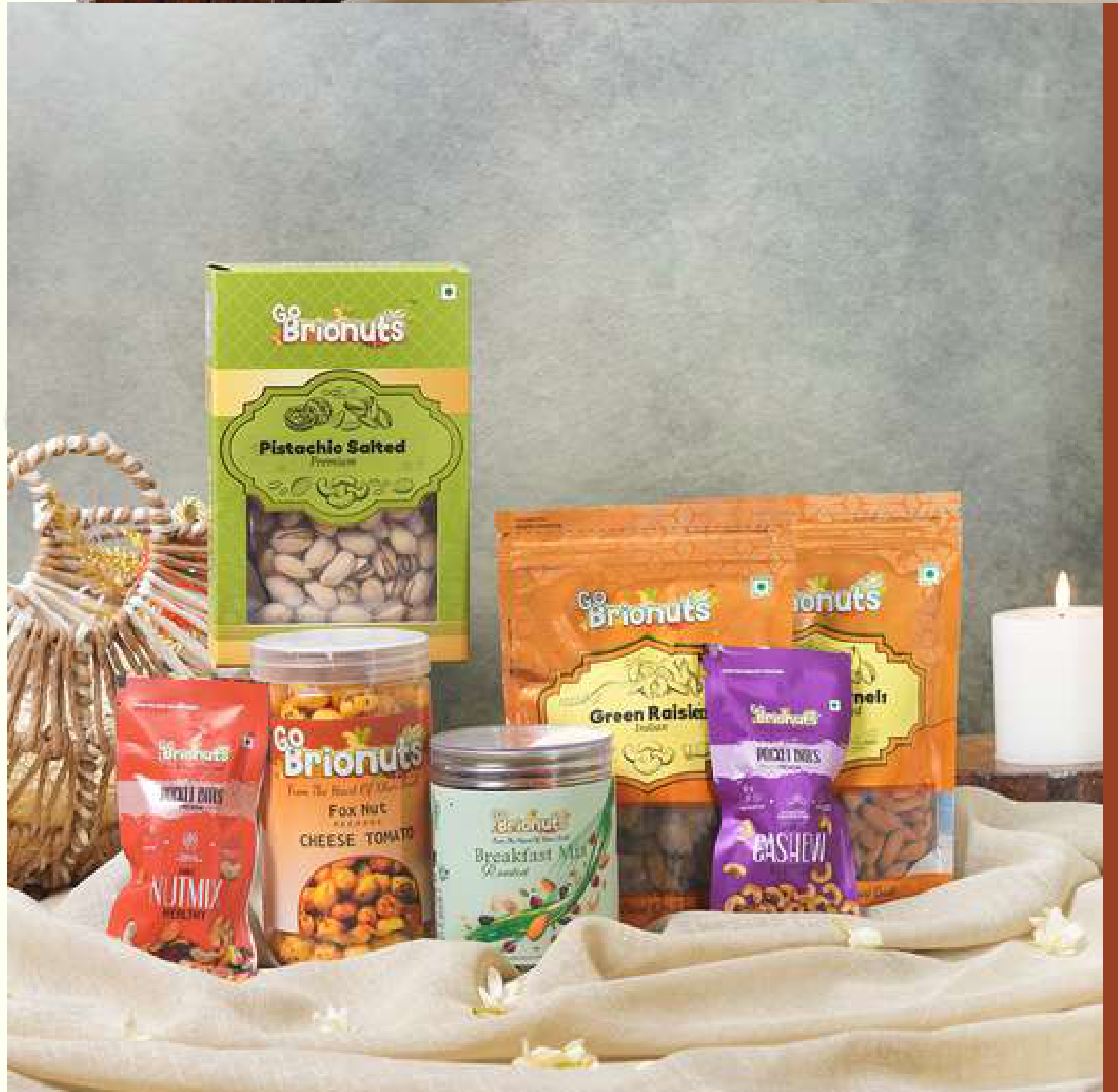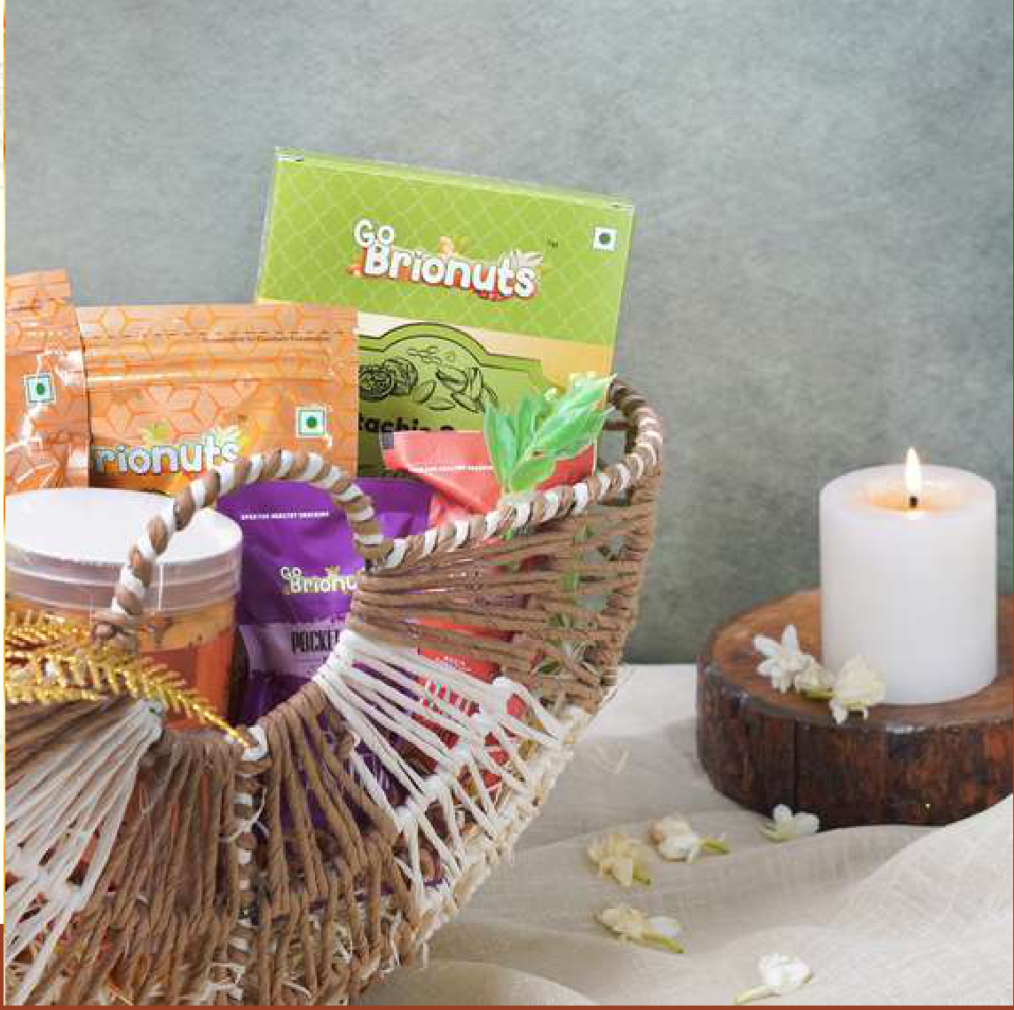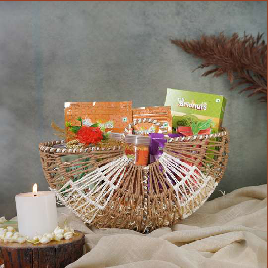 Features: Assorted snacks, Decorative basket, Includes candle and floral accent