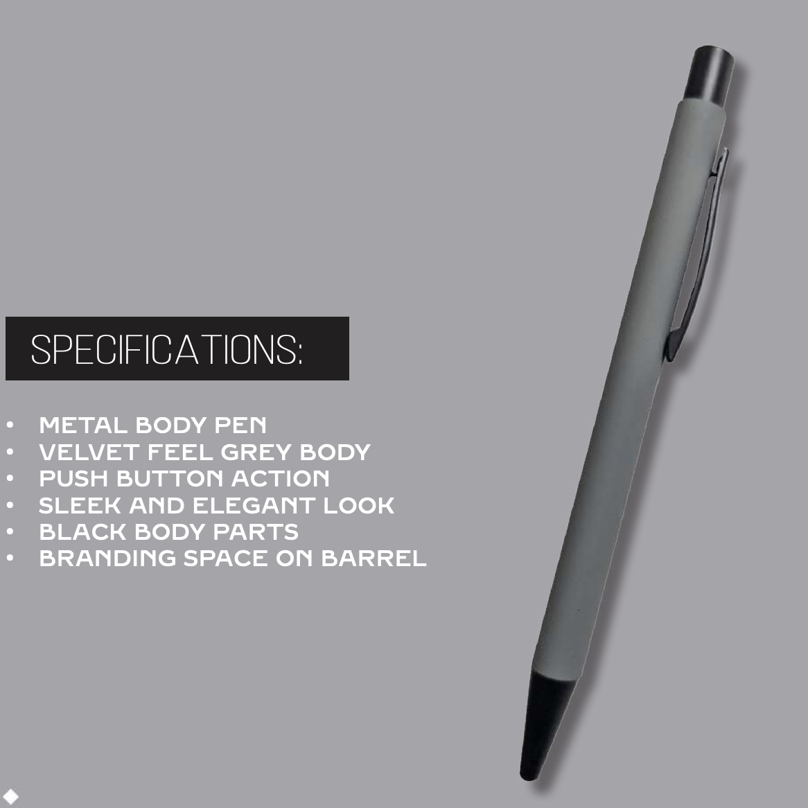 Subtle and sleek, the Grey Mist pen features a velvet-touch grey body with black detailing. The push-button mechanism and smooth form make it a refined choice for executive use, conferences, and corporate branding.