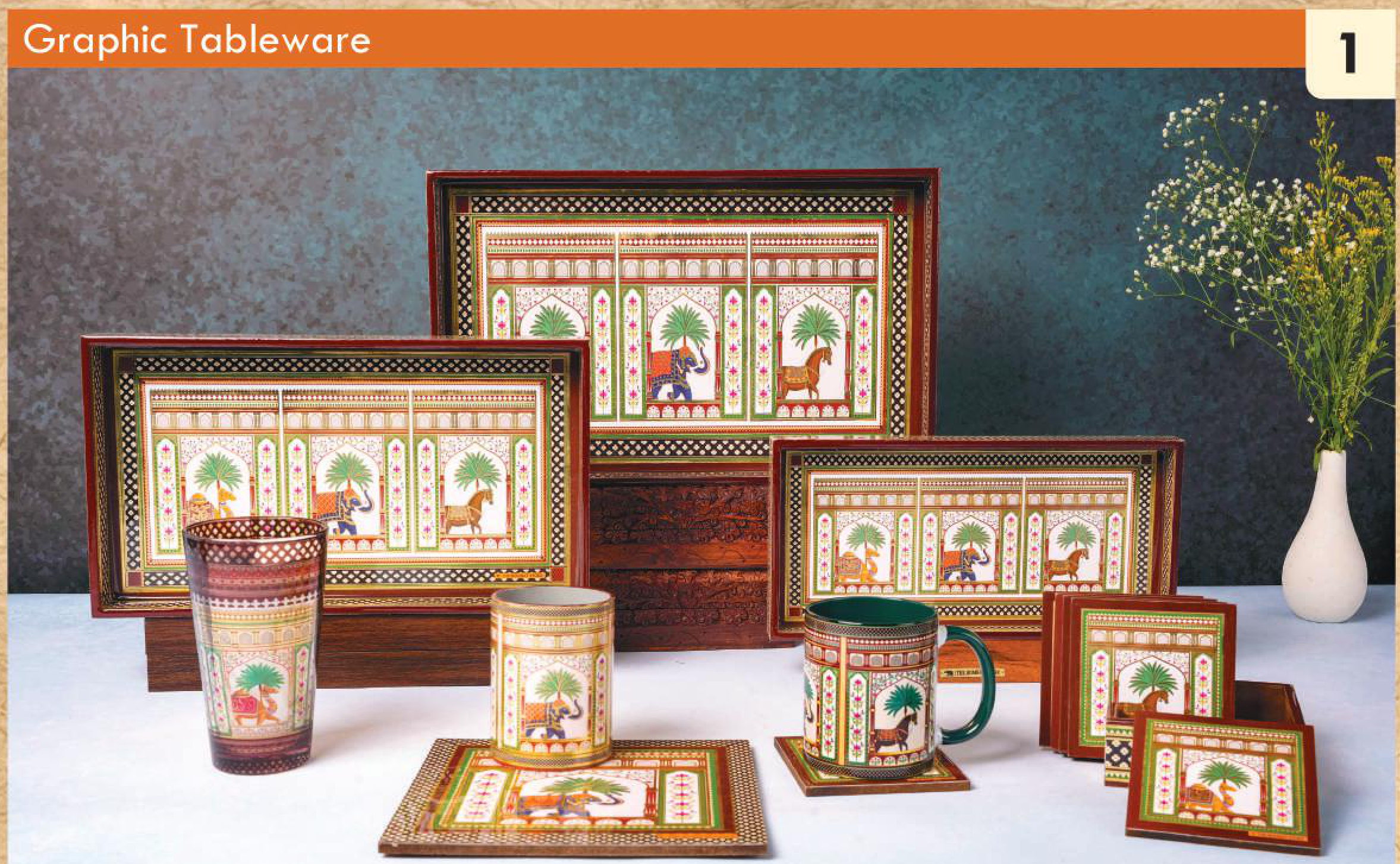 Features: Hand-painted motifs, Decorative borders, Set includes trays, mug, coasters, and tumblers