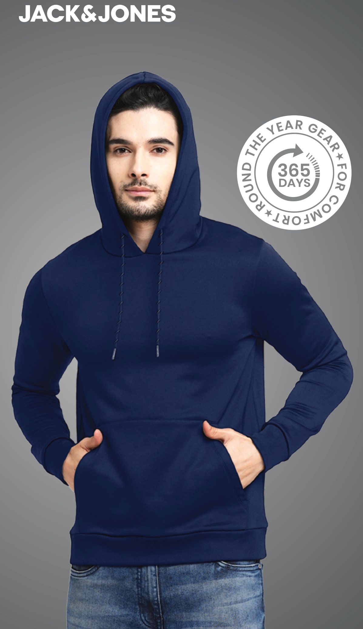 This comfortable navy blue hoodie from JACK & JONES is crafted from soft cotton for all-day wear. Featuring a classic hooded design with adjustable drawstrings and a convenient kangaroo pocket, it's perfect for casual layering.