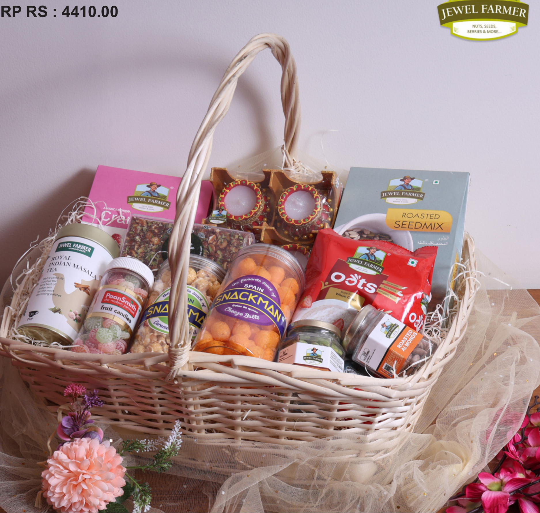 A curated selection of premium snacks and beverages, including Royal Indian Masala Tea, Roasted Seedmix, Oats, fruit candies, and cheese balls. This gift basket is elegantly presented in a woven basket, making it an ideal choice for special occasions.
