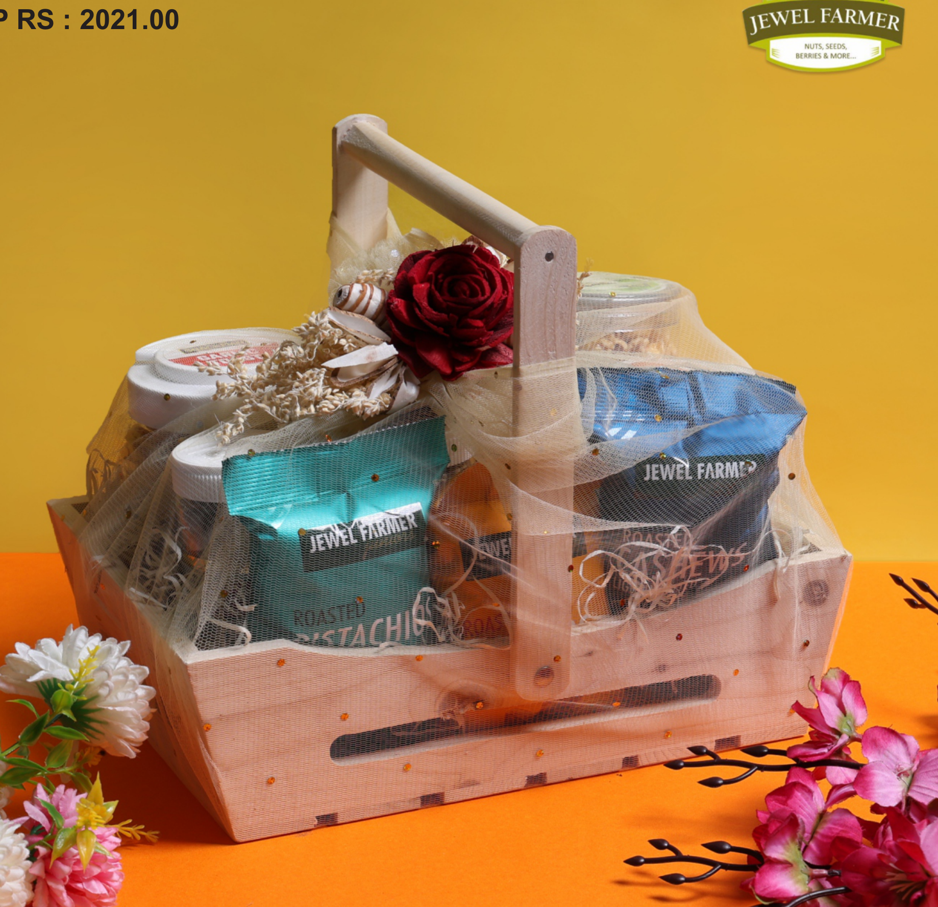 A beautifully curated gift basket featuring a selection of premium nuts and seeds from Jewel Farmer. This basket is elegantly presented with decorative elements, making it an ideal choice for special occasions or corporate gifting.