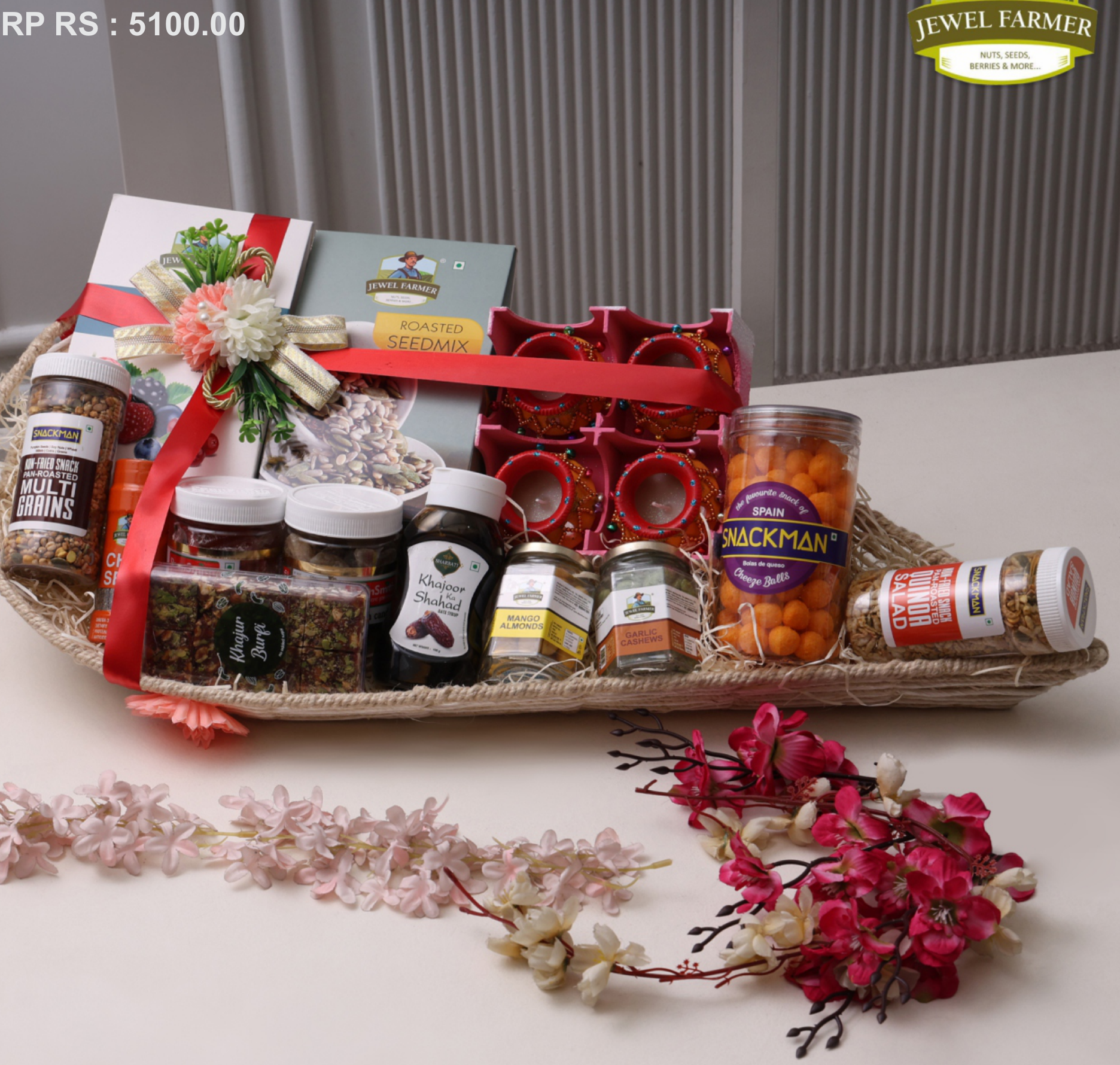 A curated gift basket featuring a selection of premium snacks including roasted seed mix, multi-grains, khajoor burfi, and cheese balls. This basket also includes decorative diyas, making it an ideal choice for festive occasions. The contents are beautifully arranged in a rustic woven basket, adorned with a festive ribbon and floral accents.