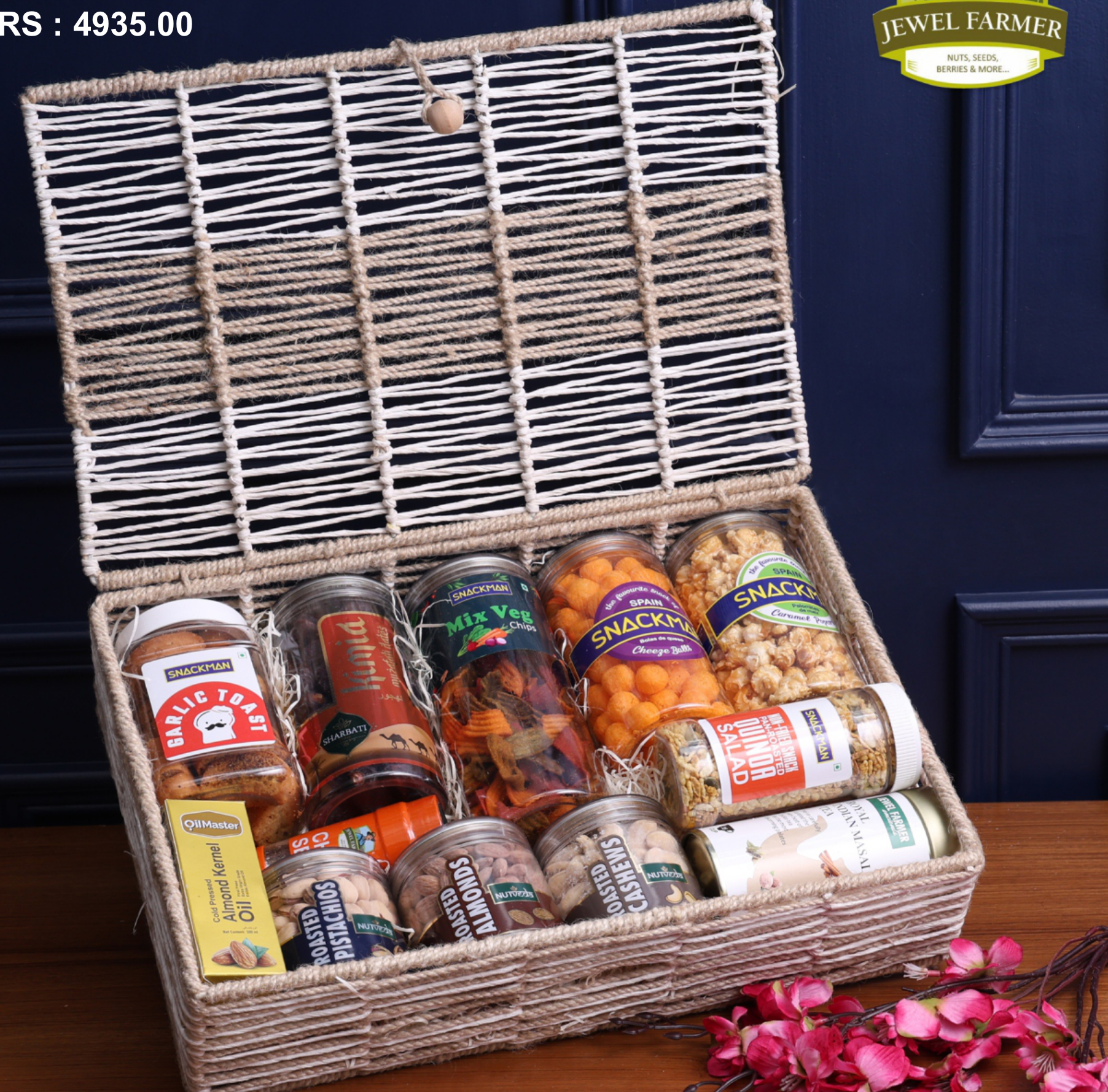 A curated selection of gourmet snacks presented in a beautifully crafted jute basket. This hamper includes a variety of savory and sweet treats, perfect for gifting or personal indulgence. Enjoy premium nuts, artisanal snacks, and delightful confections.