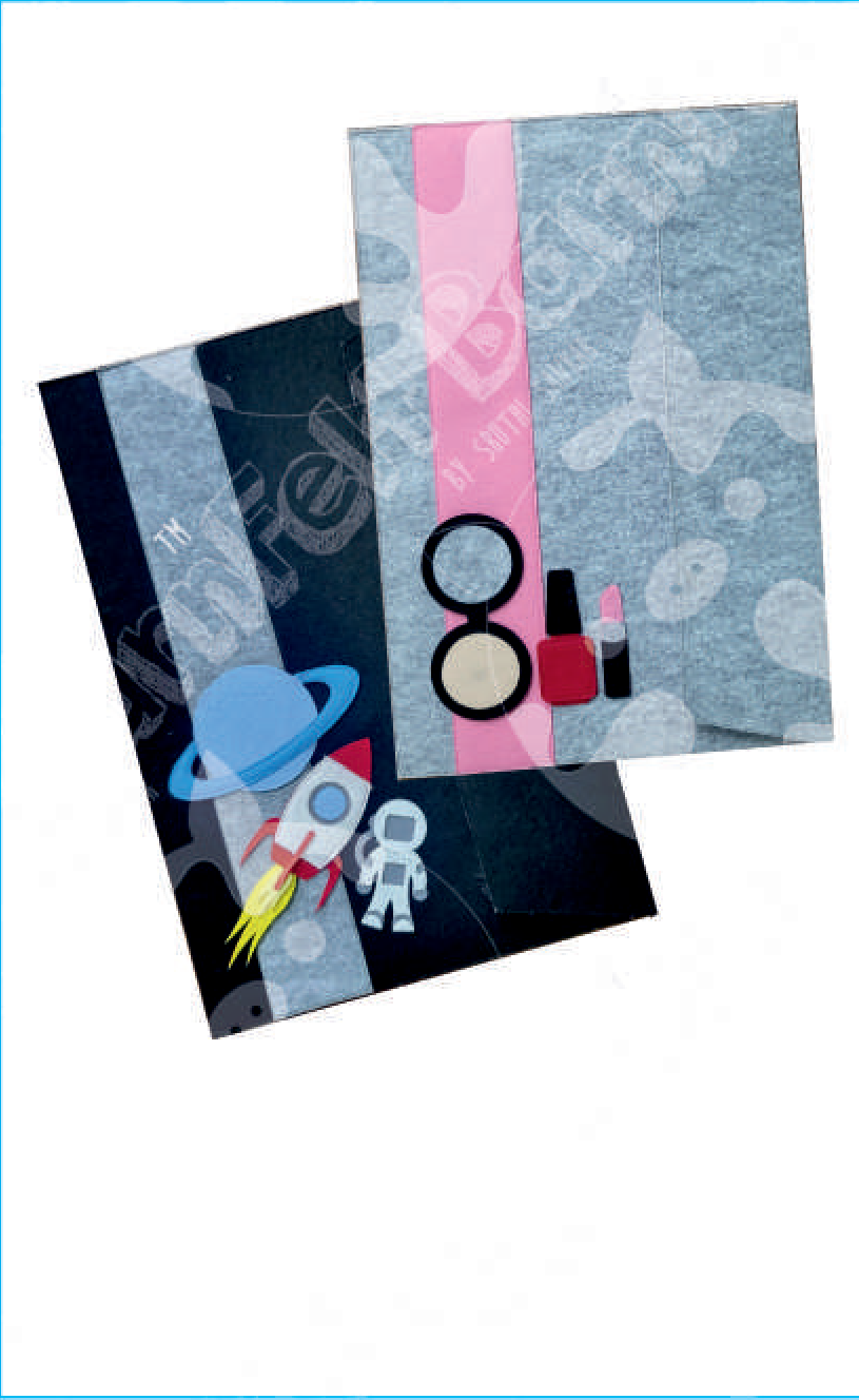 This fun stationery set features two distinct themes: one with a playful space exploration design including a rocket, astronaut, and planet, and another with a makeup theme featuring a compact, lipstick, and nail polish. Perfect for young students or creative individuals, it offers a blend of imaginative and trendy elements.