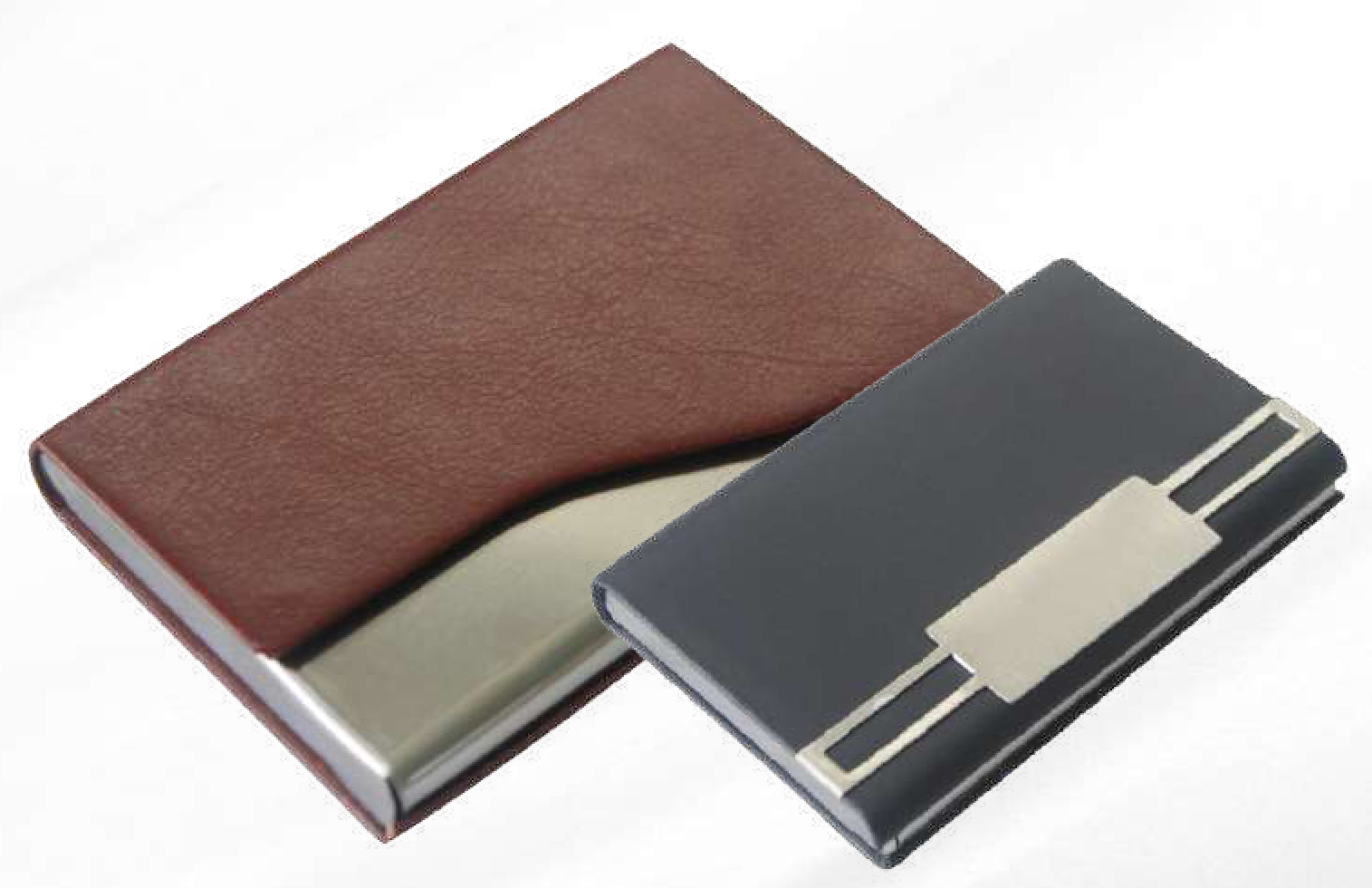 This set includes two elegant business card holders, one in rich brown leather and another in sleek dark gray. Both feature sophisticated metallic accents, offering a professional and stylish way to store and present your business cards.
