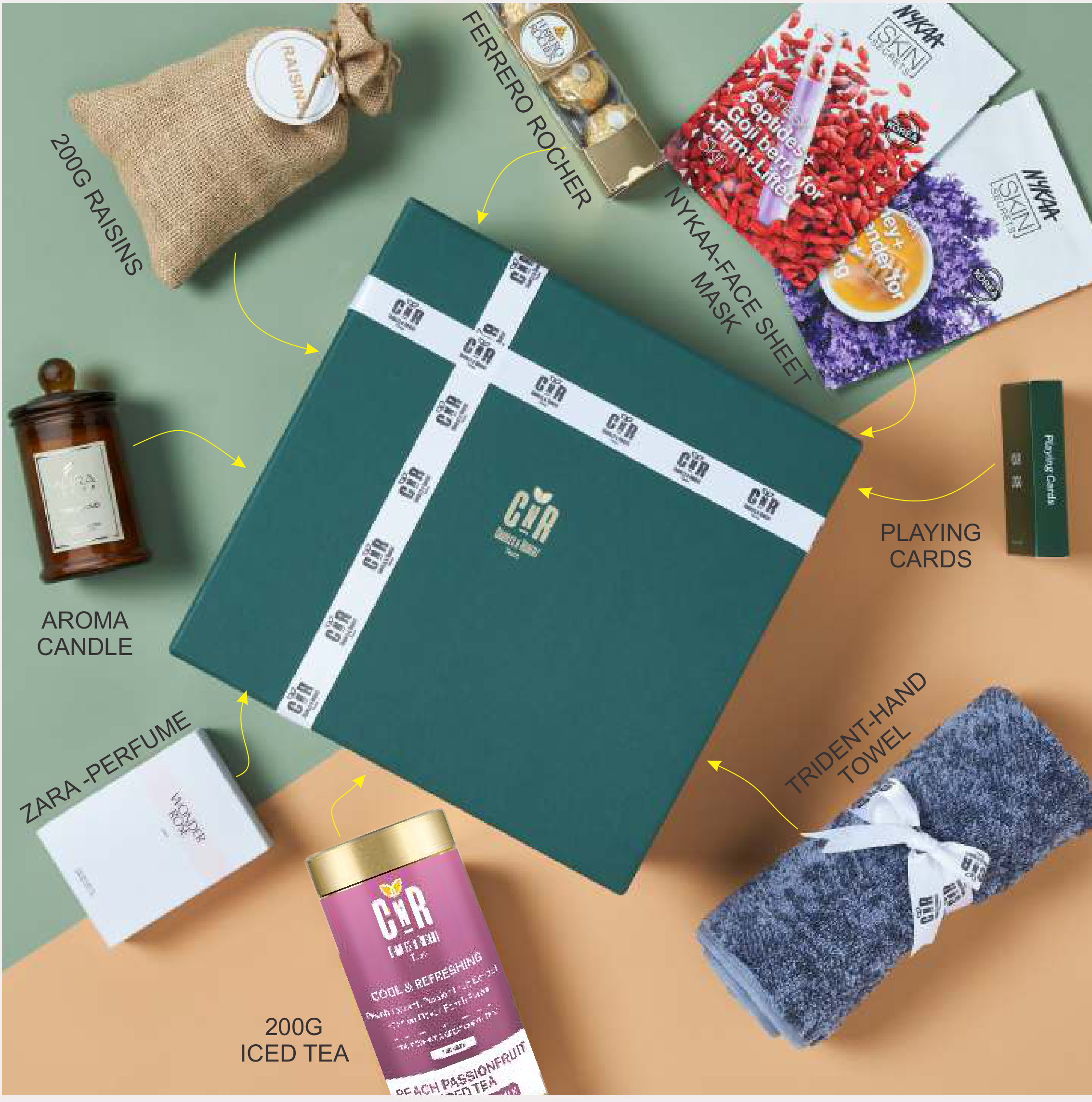 A curated gift box featuring a selection of premium items including Ferrero Rocher chocolates, Nykaa face masks, an aroma candle, 200g raisins, 200g iced tea, Zara perfume, playing cards, and a Trident hand towel. This exquisite collection is perfect for any occasion, offering a blend of indulgence and relaxation.