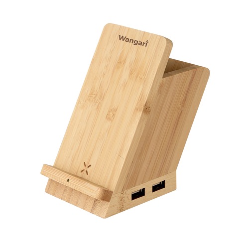 A Bamboo charger with a pen stand is a functional and aesthetically pleasing accessory that combines the functionality of a charging dock with the convenience of a pen holder. It is designed to hold and charge electronic devices such as smartphones or tablets while also providing a dedicated space for storing pens, pencils, or other writing instruments. The Bamboo charger with a pen stand is made from durable and high-quality bamboo, giving it an elegant and natural look. The overall design often incorporates a sleek and minimalist aesthetic, blending functionality with a touch of natural eleg