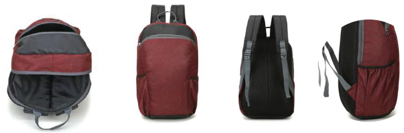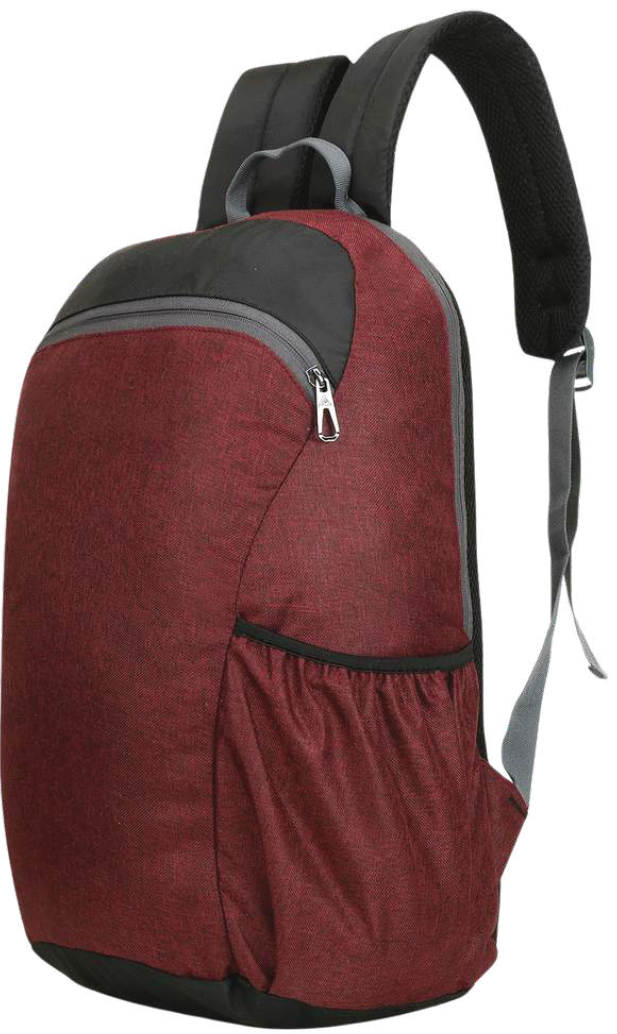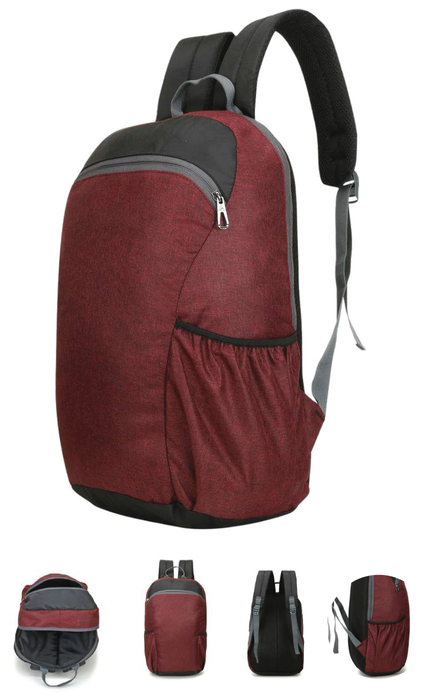 This casual backpack features a durable maroon textured fabric with black accents and grey zippers. It includes padded shoulder straps for comfort and convenient side pockets for easy access to essentials. Perfect for everyday use, school, or short trips.