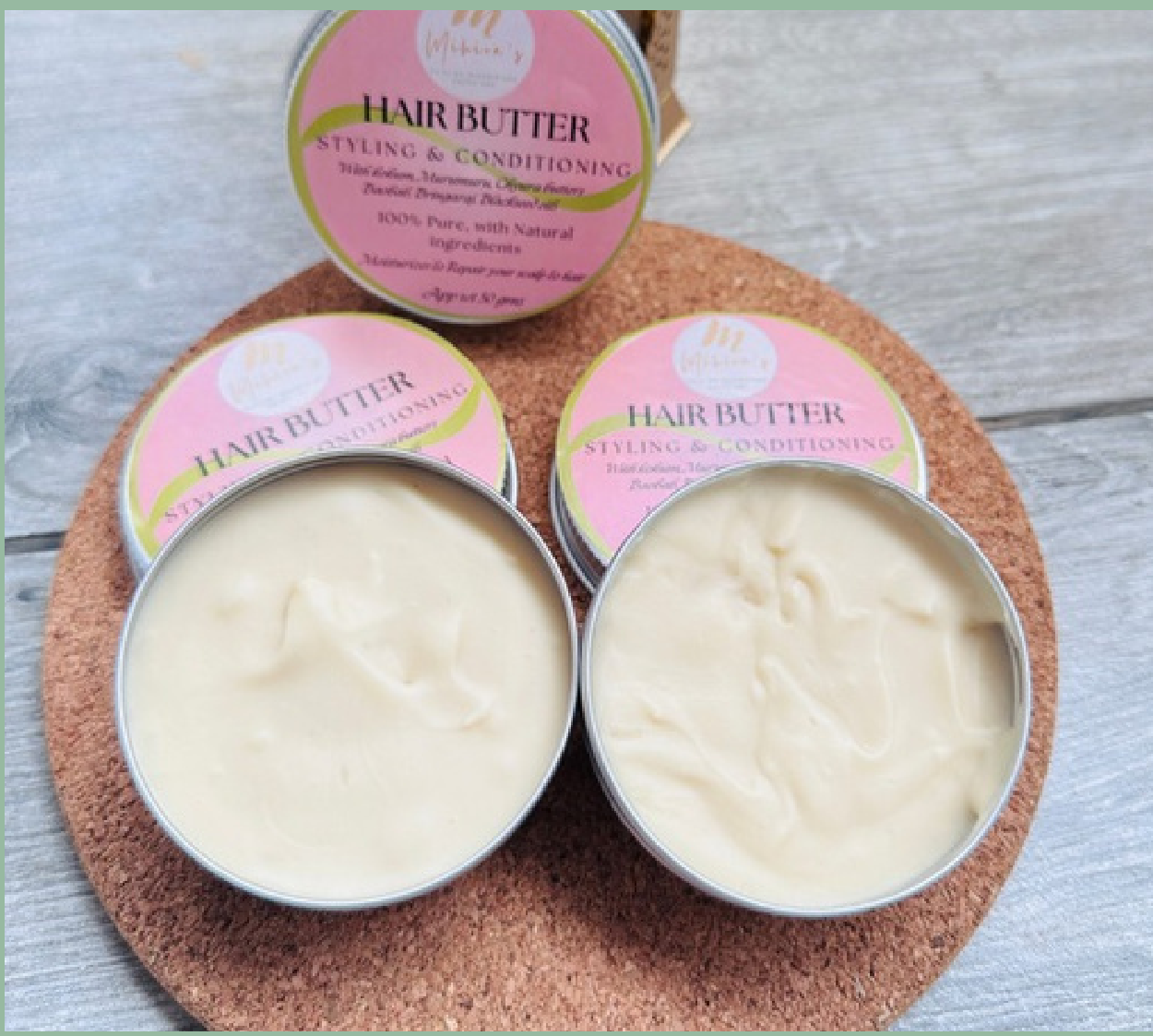 This hair butter is designed for styling and conditioning, offering a rich formula to moisturize and repair your scalp and hair. It is made with 100% pure, natural ingredients for optimal hair health.