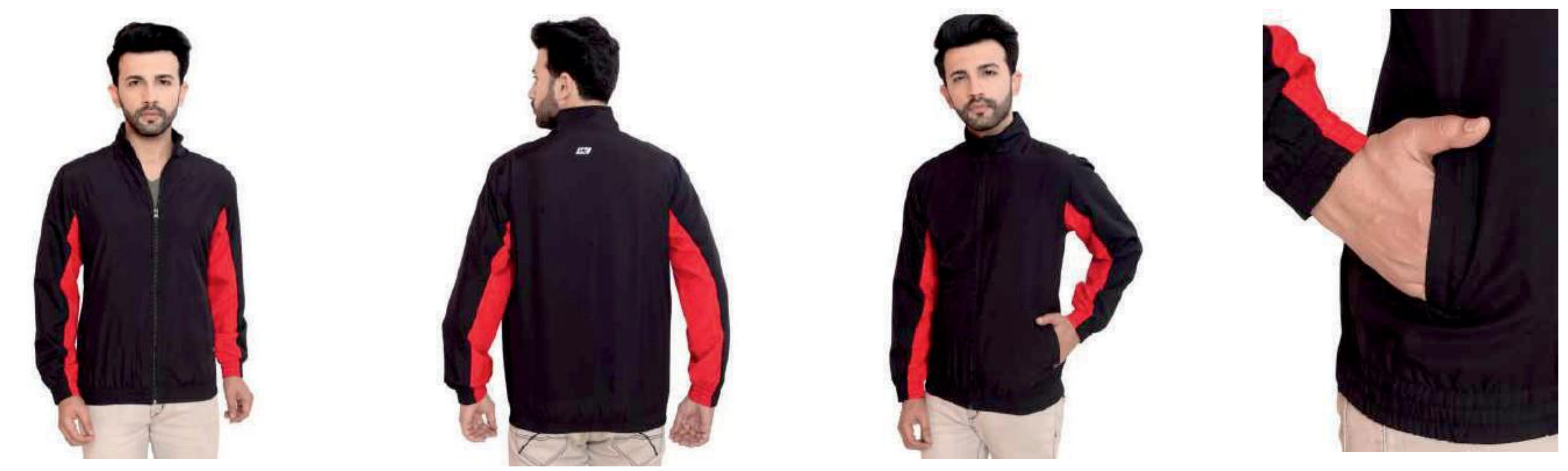 This stylish track jacket features a classic black base with striking red accents on the sleeves. Designed for comfort and practicality, it includes convenient side pockets and a full zip closure.