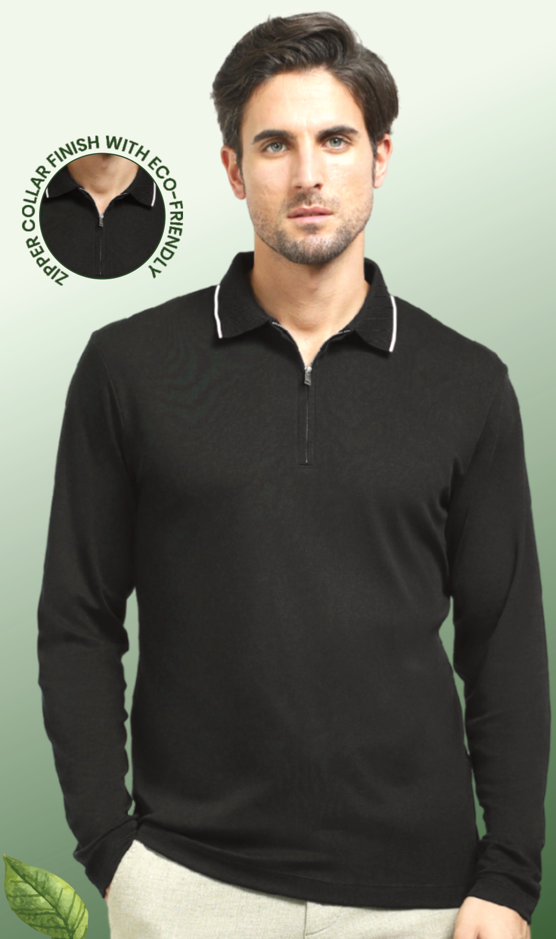 This men's long-sleeve polo shirt features a classic black color and a convenient zipper collar. The design incorporates an eco-friendly finish, making it a stylish and conscious choice for everyday wear.