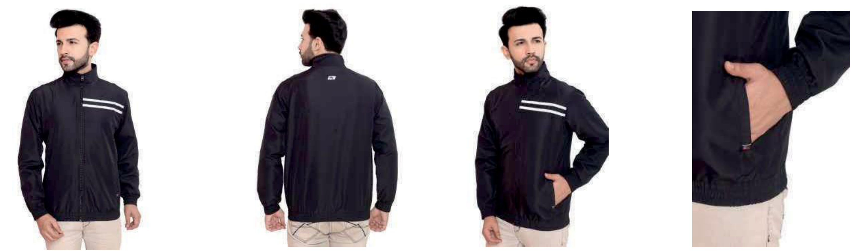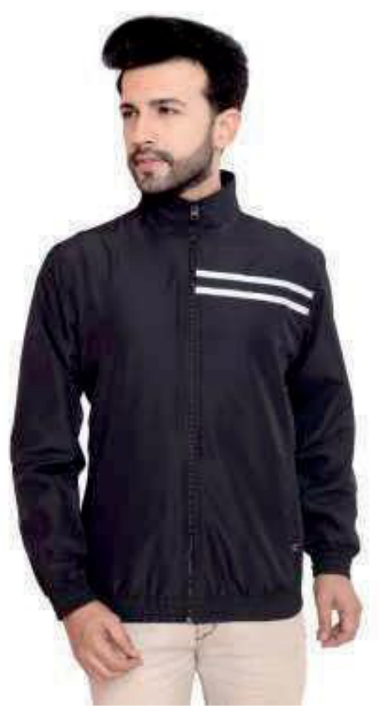 This stylish black track jacket for men features a sleek design with contrasting white stripes on the chest. It is perfect for casual wear, sports activities, or as a layering piece.