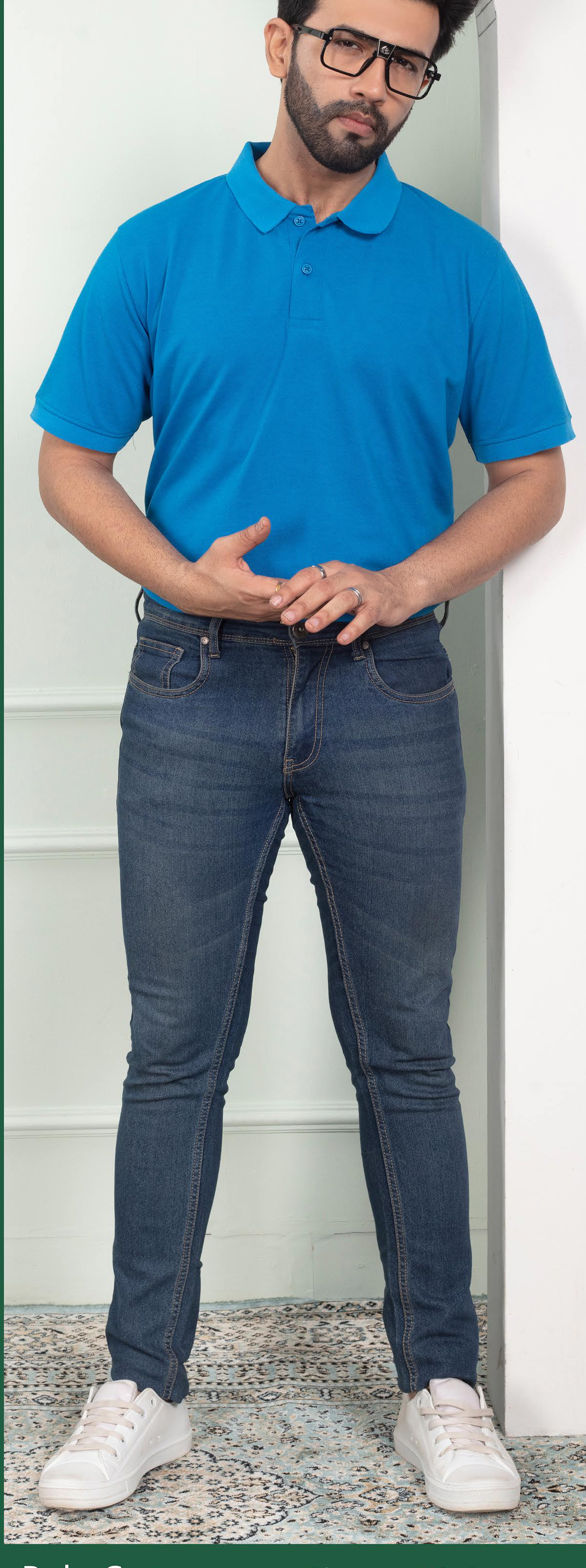 A classic combination featuring a vibrant blue cotton polo t-shirt paired with comfortable, slim-fit denim jeans. This outfit offers a casual yet put-together look suitable for everyday wear.