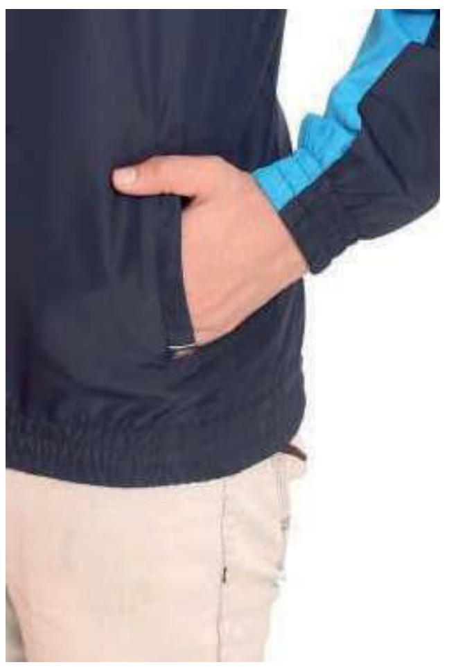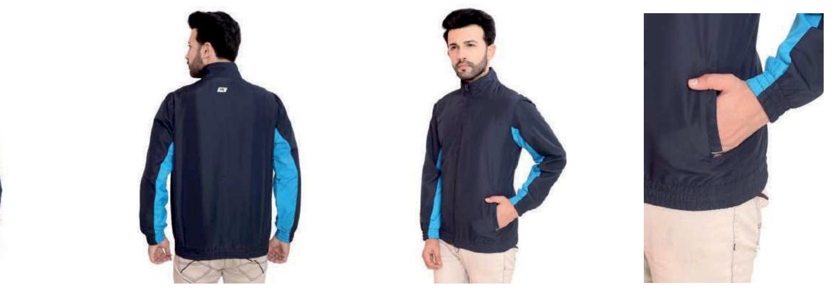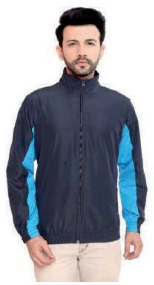 This stylish track jacket features a classic navy blue body with contrasting sky blue panels on the sleeves. It offers a comfortable fit and a sporty design, perfect for casual wear or light athletic activities.