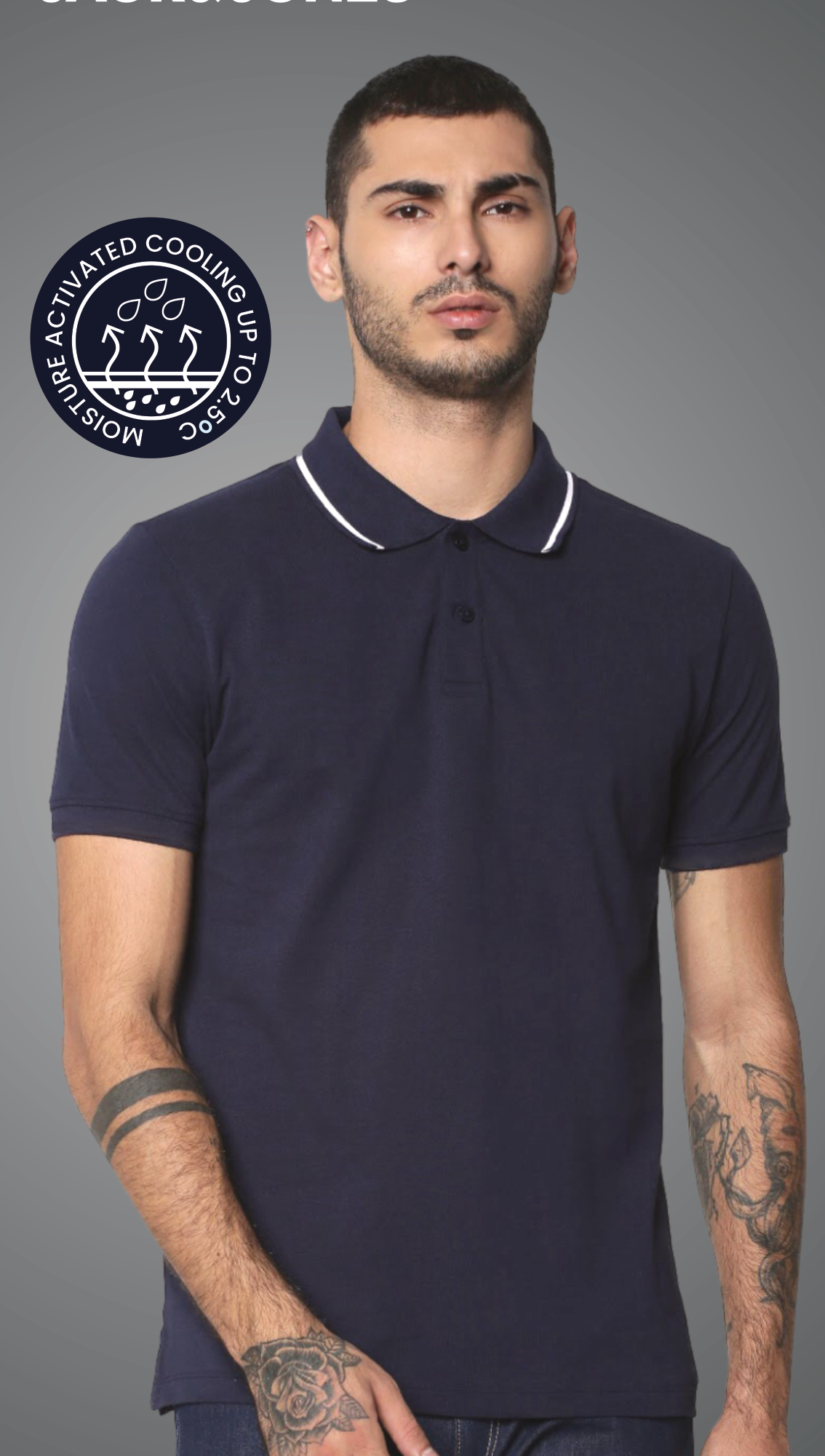 This men's navy blue polo shirt features a classic design with a contrasting white collar. It is crafted with fabric that offers activated cooling, reducing body temperature by up to 2.5°C for enhanced comfort.