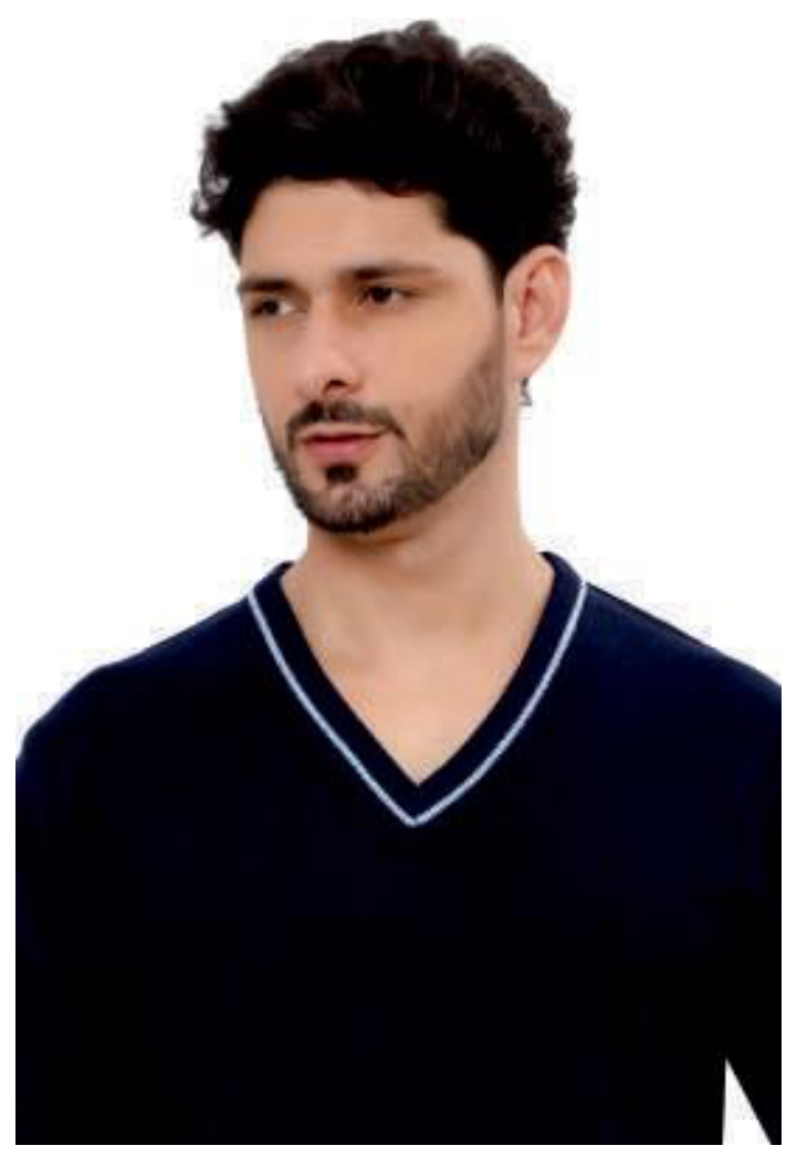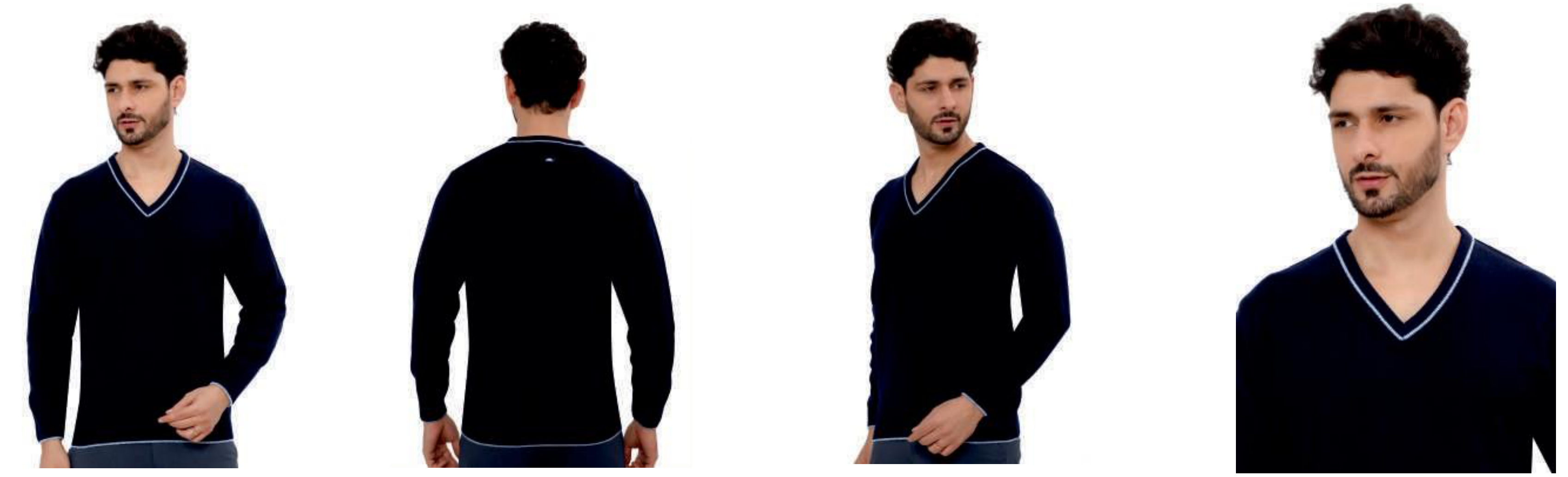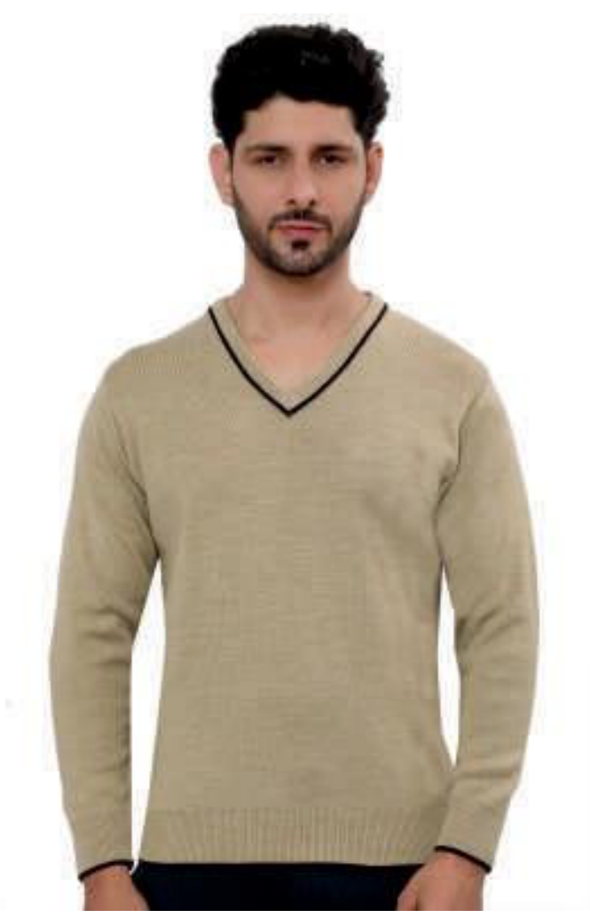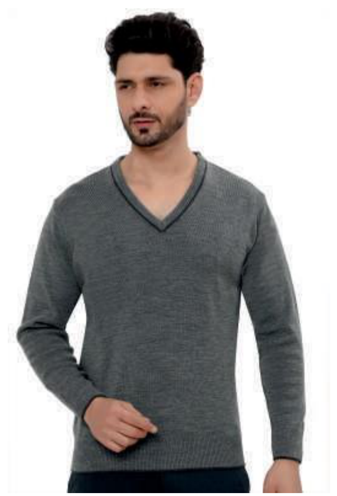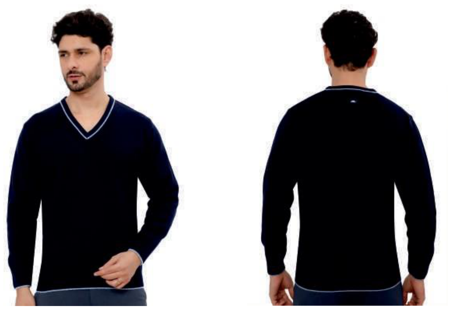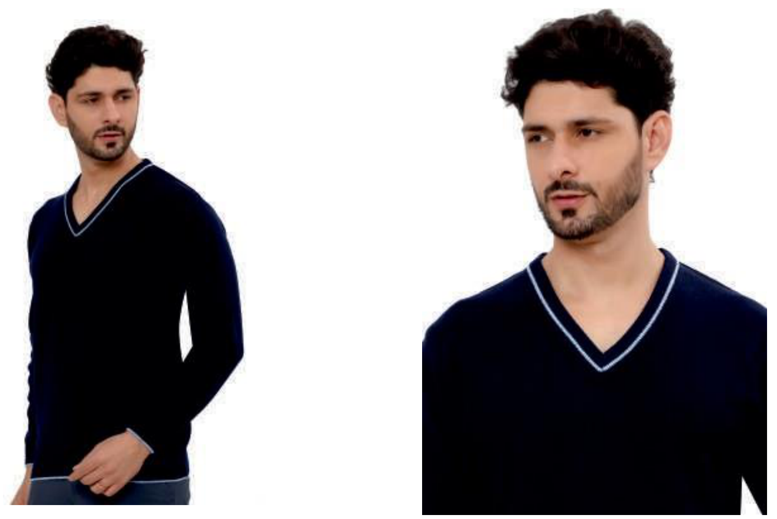 A classic navy blue V-neck sweater for men, featuring full sleeves and a subtle contrasting trim along the neckline and hem. This versatile sweater is perfect for layering and offers a comfortable fit for everyday wear.