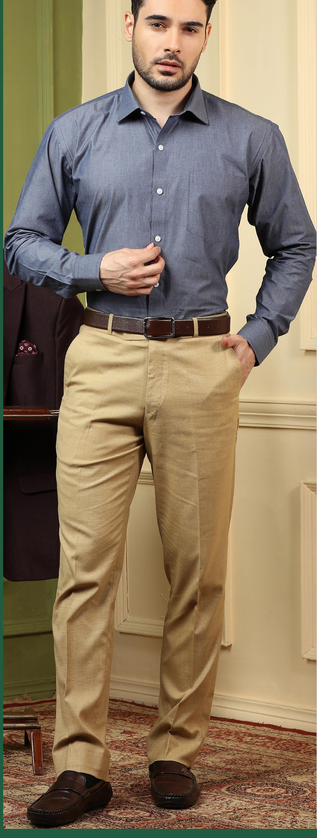 A sophisticated ensemble featuring a textured blue dress shirt paired with classic beige chinos. This set offers a polished look suitable for both casual and semi-formal occasions, crafted for comfort and style.