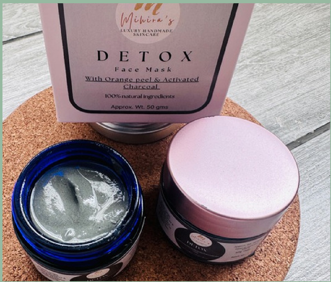 Experience a deep cleanse with Mihira's Detox Face Mask, formulated with 100% natural ingredients including orange peel and activated charcoal. This luxurious mask helps to purify and rejuvenate your skin, leaving it feeling refreshed and revitalized. Approx. Wt. 50 gms.