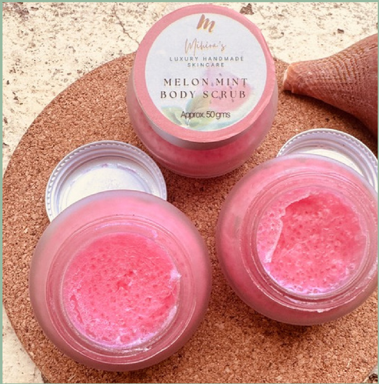 Indulge in Mihira's Luxury Handmade Melon Mint Body Scrub for a refreshing and exfoliating experience. This scrub is crafted with high-quality ingredients to leave your skin feeling smooth and revitalized. Approximately 50gms per jar.
