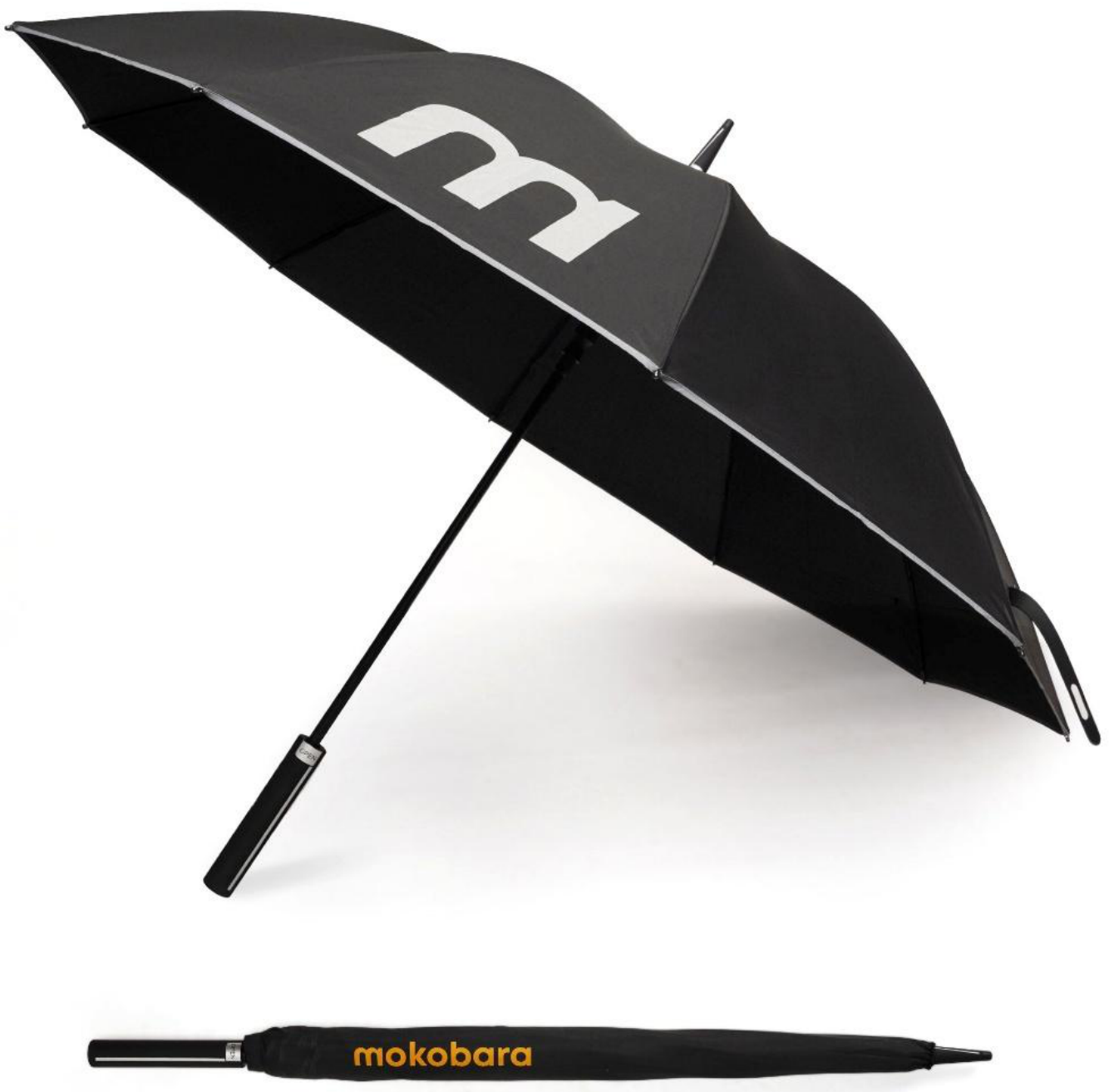 A durable and stylish black umbrella featuring the Mokobara logo. This umbrella is designed for practical use, offering reliable protection from the elements. It comes with a matching sleeve for easy storage and transport.