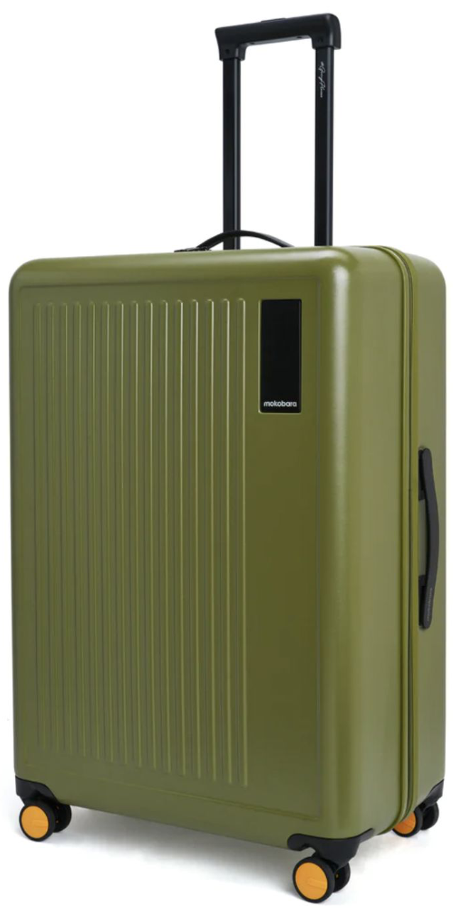 This Mokobara hardside spinner luggage features a durable olive green shell with a ribbed texture for added style and protection. It is equipped with a retractable handle and smooth-gliding wheels for effortless maneuverability. The compact design makes it ideal for travel.