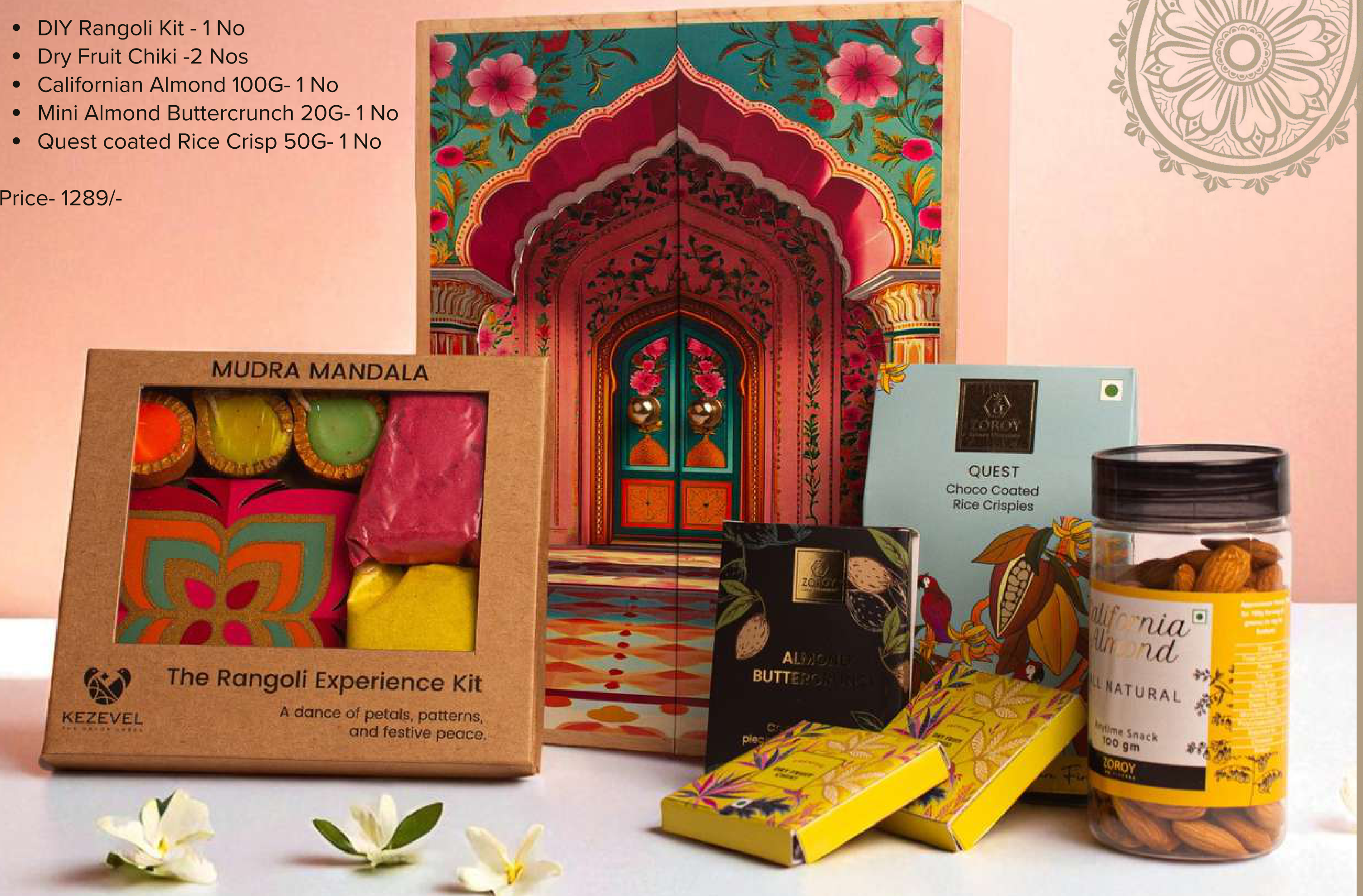 This festive gift box includes a DIY Rangoli Kit for creative expression, along with a selection of delicious snacks. Enjoy dry fruit chiki, Californian almonds, almond buttercrunch, and chocolate-coated rice crispies for a complete celebratory experience.