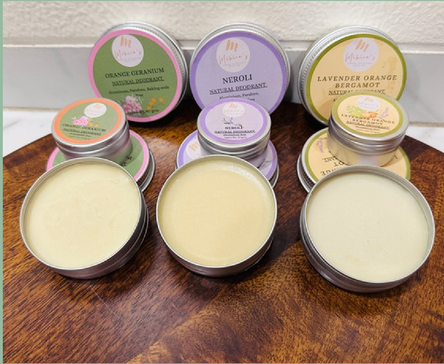 Experience natural freshness with our range of aluminum-free, paraben-free deodorants. Available in invigorating scents like Orange Geranium, Neroli, and Lavender Orange Bergamot, these deodorants are formulated with baking soda for effective odor control. Presented in convenient metal tins, they are perfect for everyday use and travel.