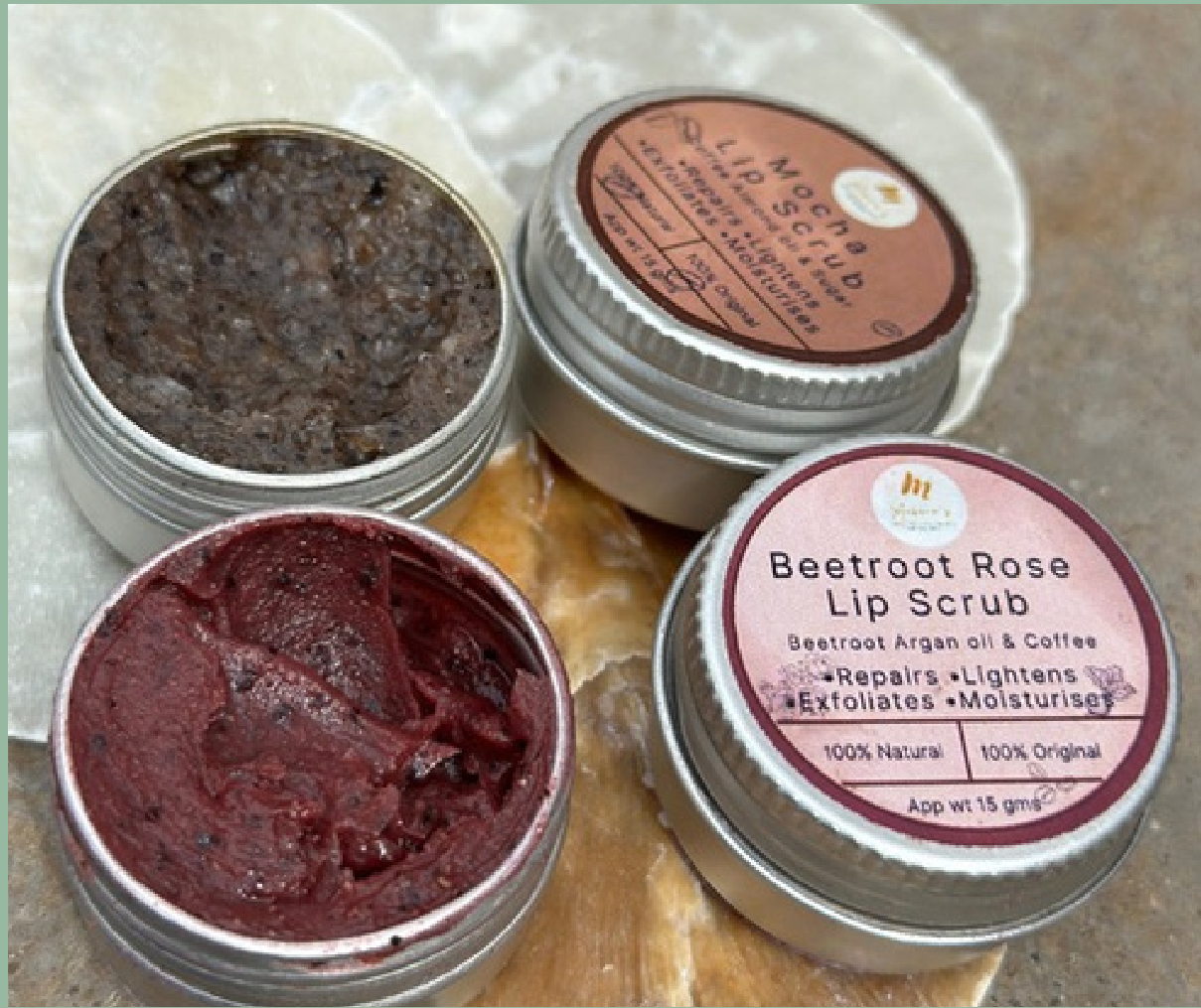 This set includes two natural lip scrubs: Mocha and Beetroot Rose. Formulated with ingredients like coffee, beetroot argan oil, and sugar, these scrubs exfoliate, moisturize, and repair lips. Each tin contains approximately 15 grams of product.
