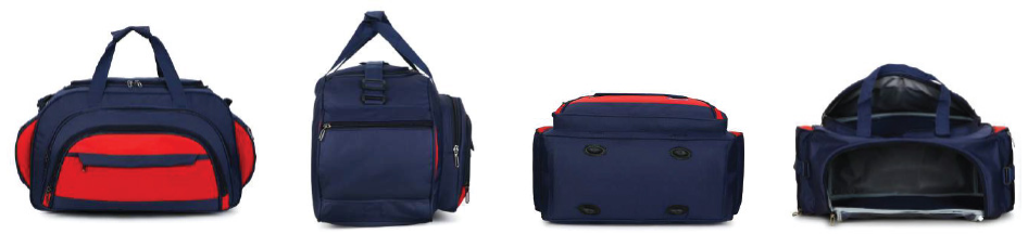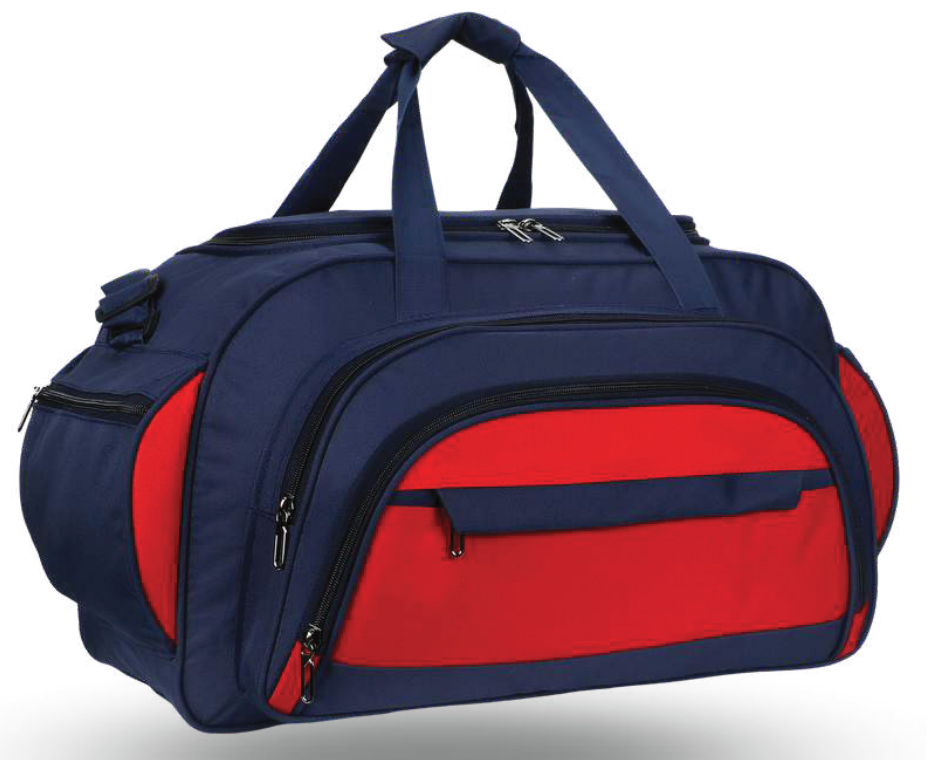 This duffle bag features a durable navy blue and red color block design, perfect for travel or gym use. It offers ample storage with multiple zippered compartments and comfortable carrying handles.