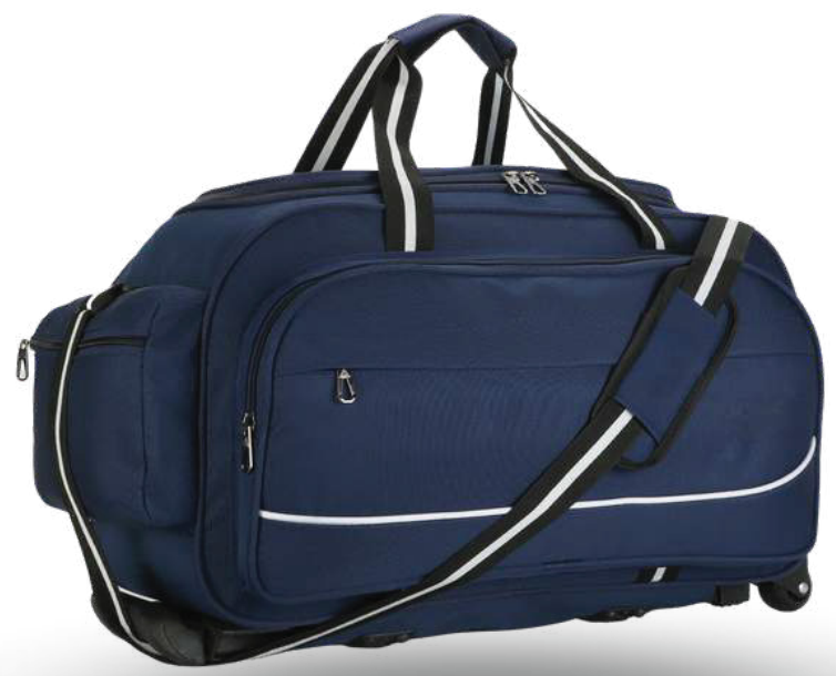 This navy blue wheeled duffel bag is designed for practicality and convenience. It features multiple exterior pockets for easy access to essentials and durable wheels for effortless transport. The adjustable shoulder strap and sturdy top handles offer versatile carrying options.