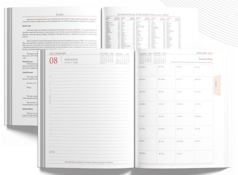 A twin to the previous model, this engineering diary shares the same professional structure – 392 pages of 70 GSM superfine white paper, 64 pages of engineering data, a dual-colour inner design, and a smart monthly indicator. Its robust matte laminated cover with Crystal UV coating ensures it stands up to everyday use.