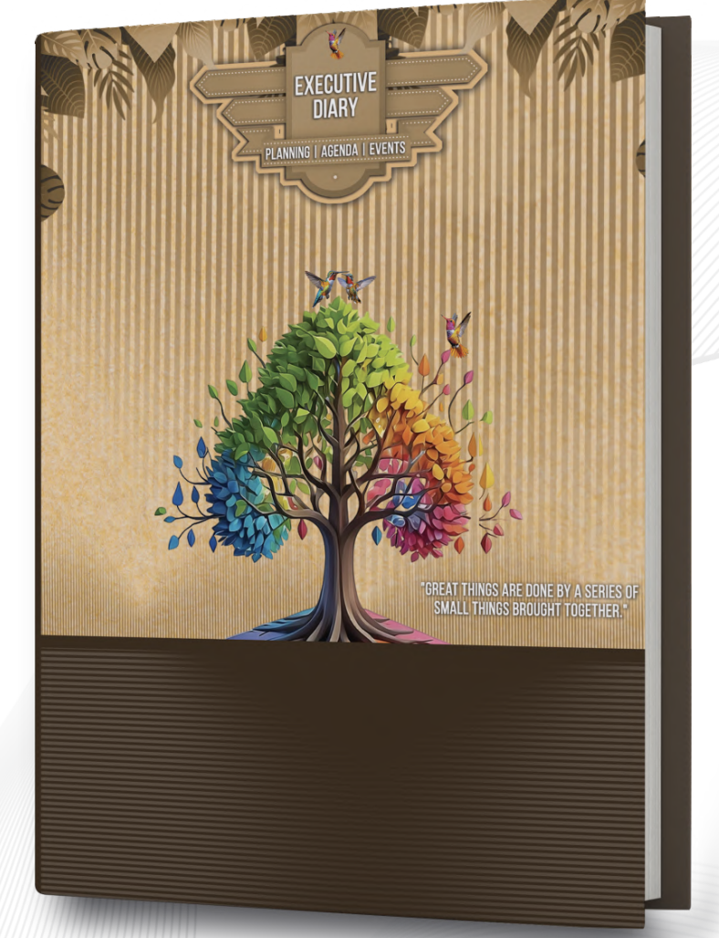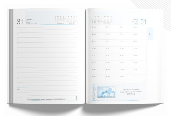 Bursting with vibrant professionalism, this 183x245 mm diary offers 400 pages of 70 GSM natural paper with a colourful corporate inner design. A separate page for Sundays and a built-in monthly indicator make it highly functional, while its hardbound matte laminated cover with Crystal UV adds to its modern elegance.