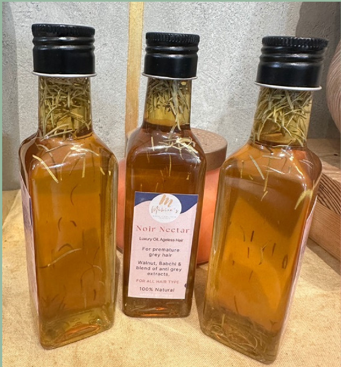 This luxury hair oil, Noir Nectar, is formulated for premature grey hair. It features a blend of Walnut, Babchi, and other natural extracts to combat greying. Suitable for all hair types, this 100% natural oil promotes ageless hair.