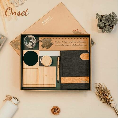 The Onset Gift Hamper combines sustainability and innovation with a selection of premium items: the Willow 3.0 15W Wireless Charger with Cup Warmer & Phone Stand, Cherry Bamboo Wireless Earbuds, a Custom Table Top Calendar 2025, an Eco-Friendly Diary with Black Denim and Cork Texture with Flap Clip, and a Wooden Finish Ball Pen with Stylus and Ruler. A thoughtful blend of functionality and sustainability for any occasion.