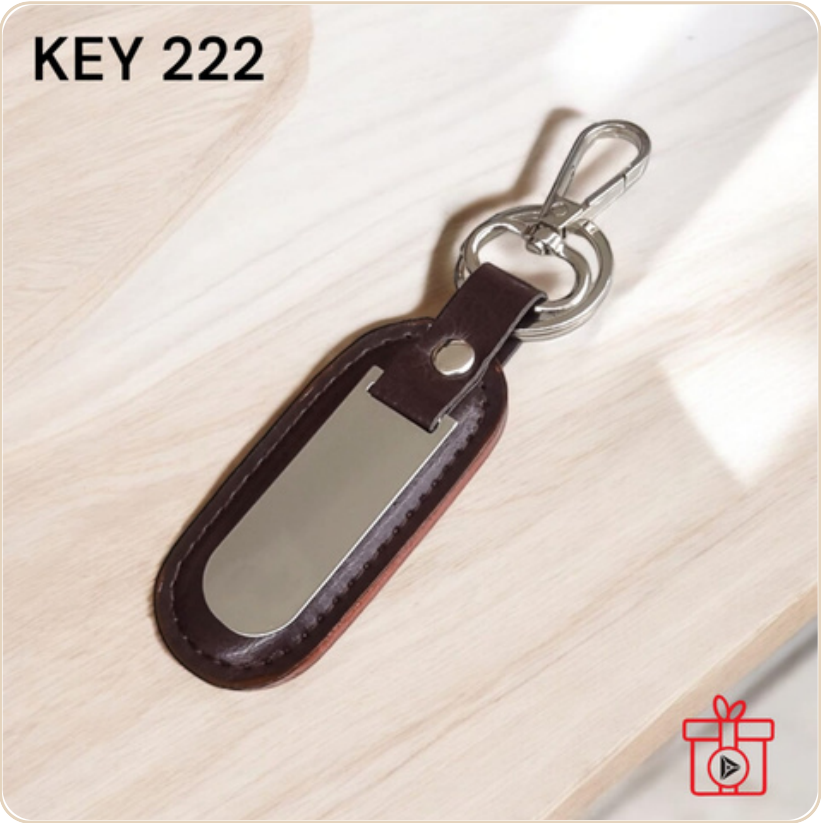 A classic oval-shaped keychain featuring a durable dark brown leather strap and a polished metal insert. This keychain is designed for practicality and style, perfect for everyday use.