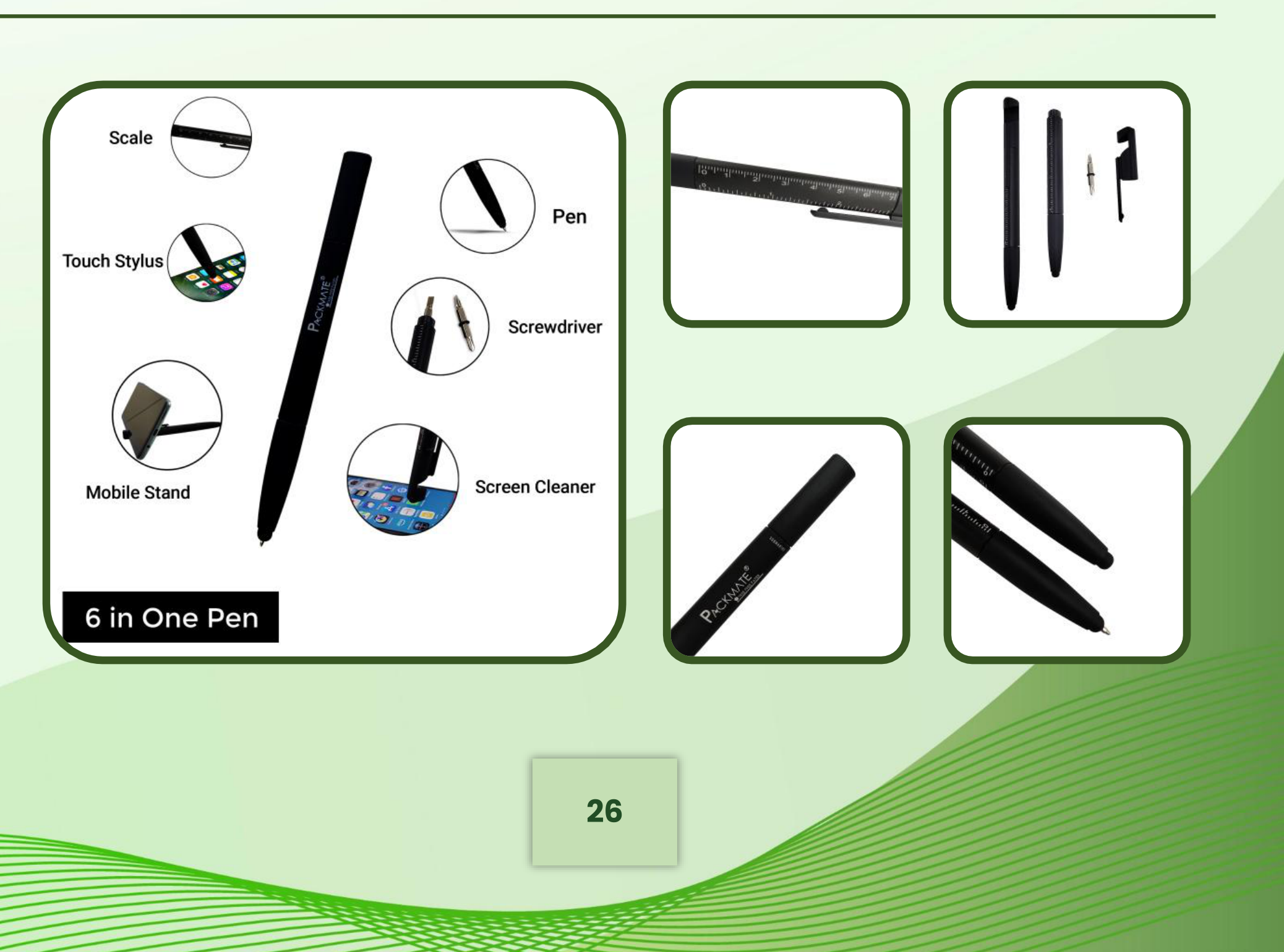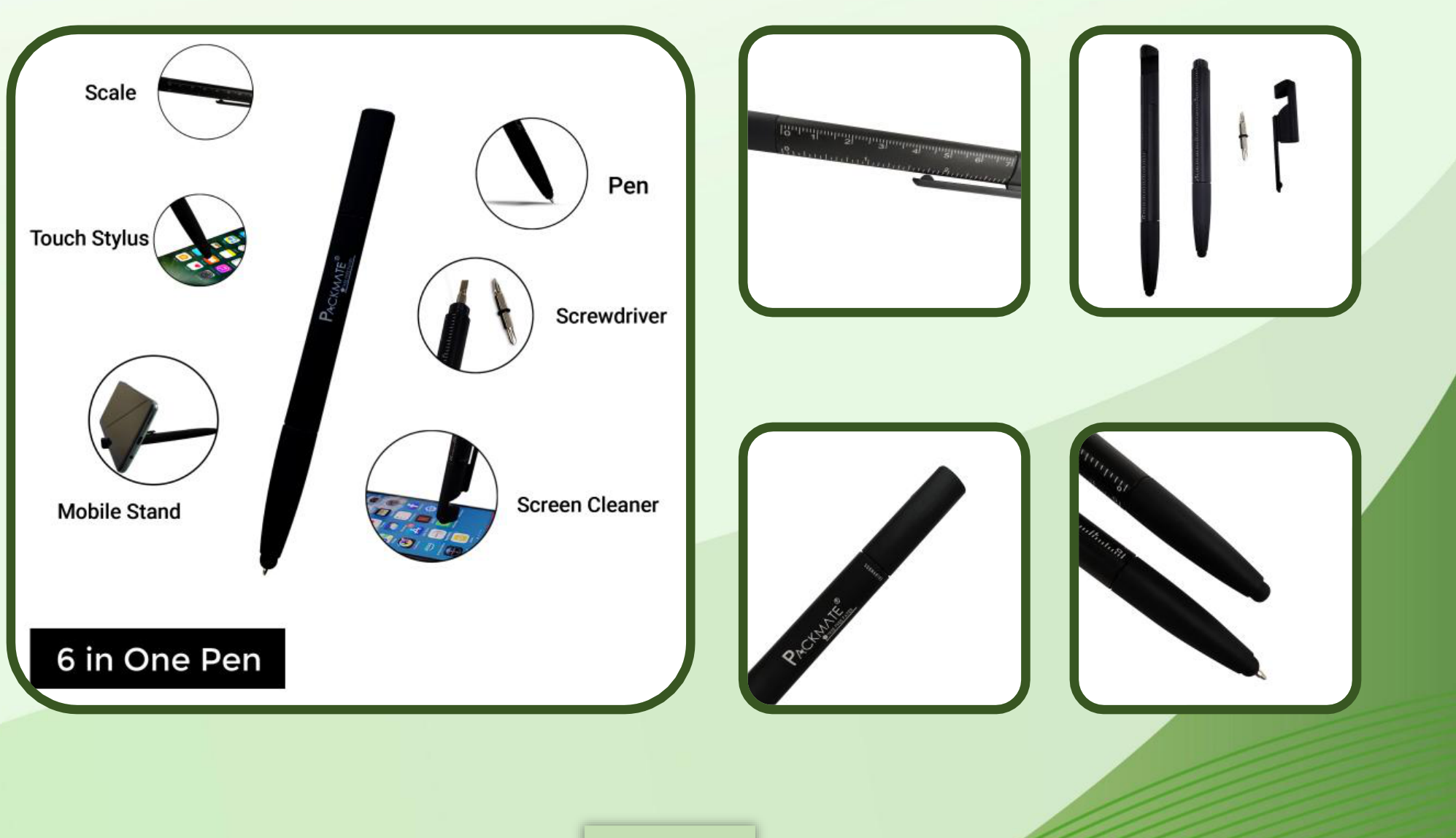 This versatile 6-in-1 pen from Packmate combines essential tools for everyday use. It features a writing pen, touch stylus, mobile stand, screen cleaner, and a screwdriver, making it a practical accessory for students and professionals alike.