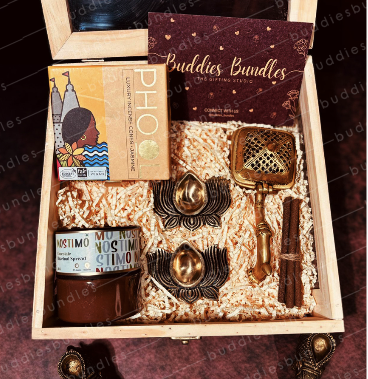 traditional pinewood hamper featuring a brass dhoop dhani, a pair of copper diyas, dhoop sticks, and cones. Ideal for those who cherish classic elegance and spiritual ambiance.