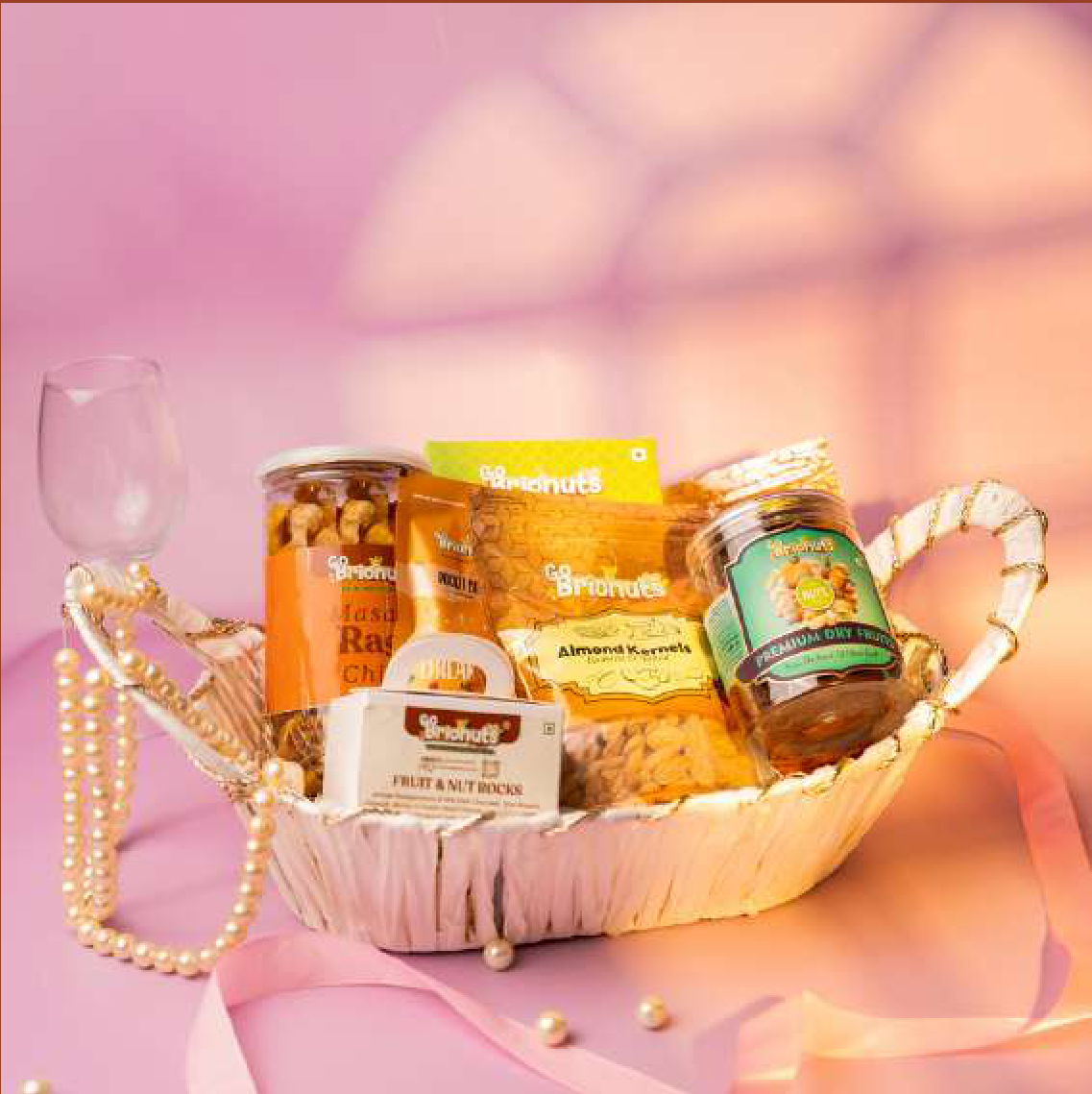 An exquisite gift basket filled with a curated selection of premium dry fruits and nuts. Perfect for gifting on special occasions, this basket offers a delightful assortment of healthy and delicious treats.