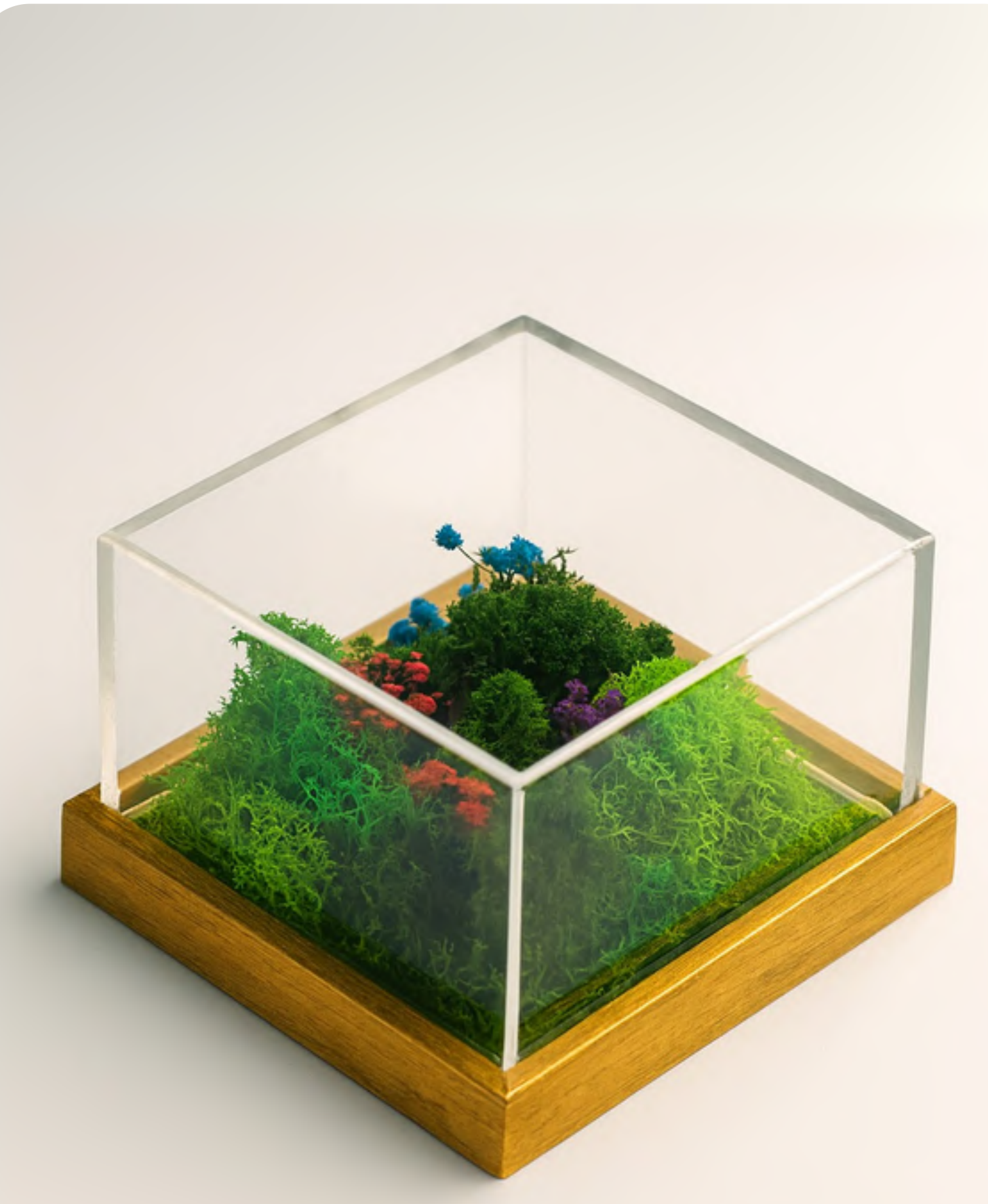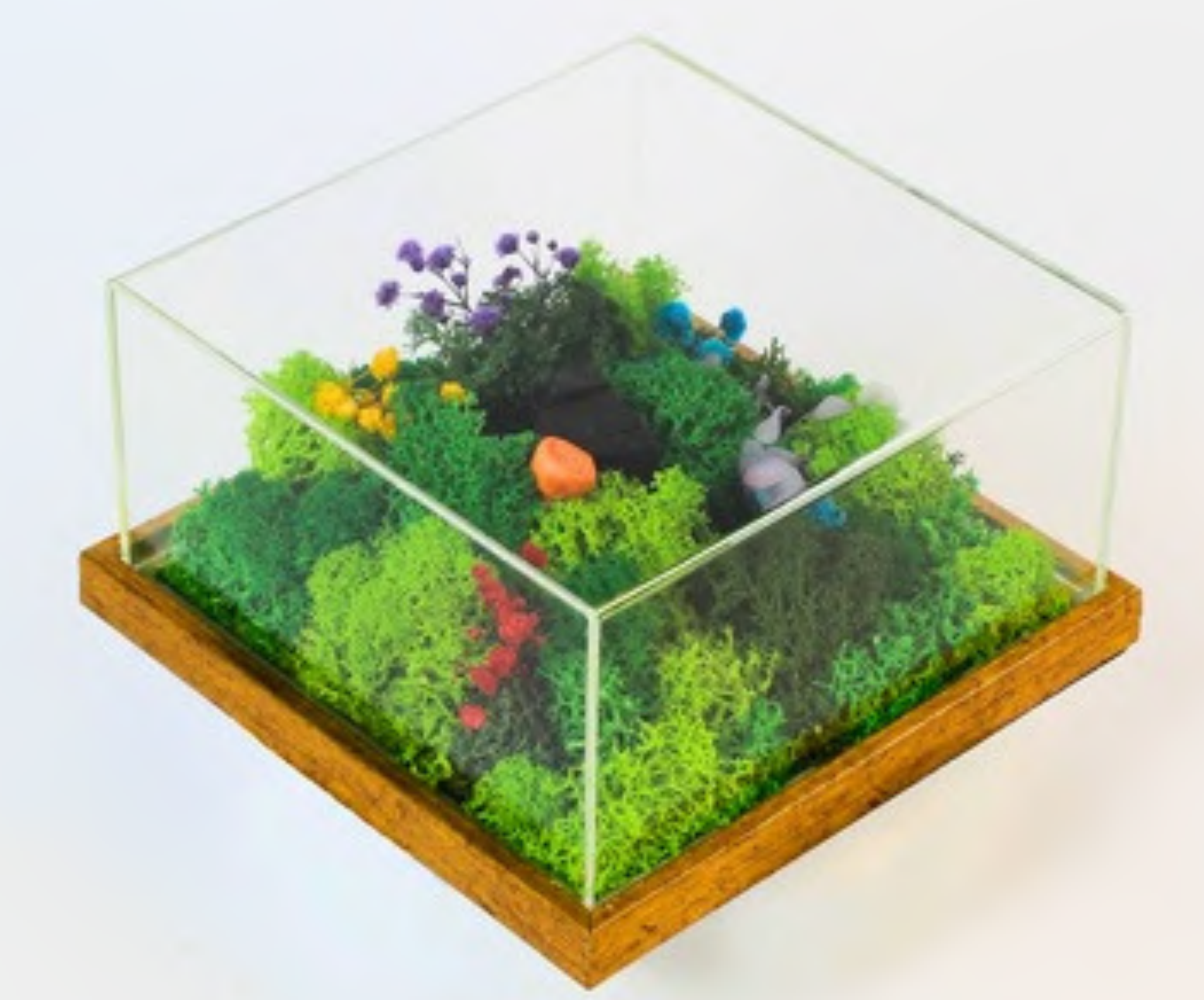 A charming preserved moss terrarium featuring vibrant green mosses, colorful accents, and natural stones. Encased in a clear acrylic box with a rustic wooden base, this piece brings a touch of nature indoors without the need for maintenance.