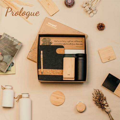 The prologue Gift Hamper includes the Wangari Maple15W Wireless Charger & USB Hub with Pen Stand, a sleek 500ml Stainless Steel Sipper Flask (Black), a Custom Table Top Calendar 2025, an Eco-Friendly Diary with black denim and cork texture, and a Wooden Finish Ball Pen with a stylus and ruler. A thoughtful blend of functionality and sustainability for any occasion.