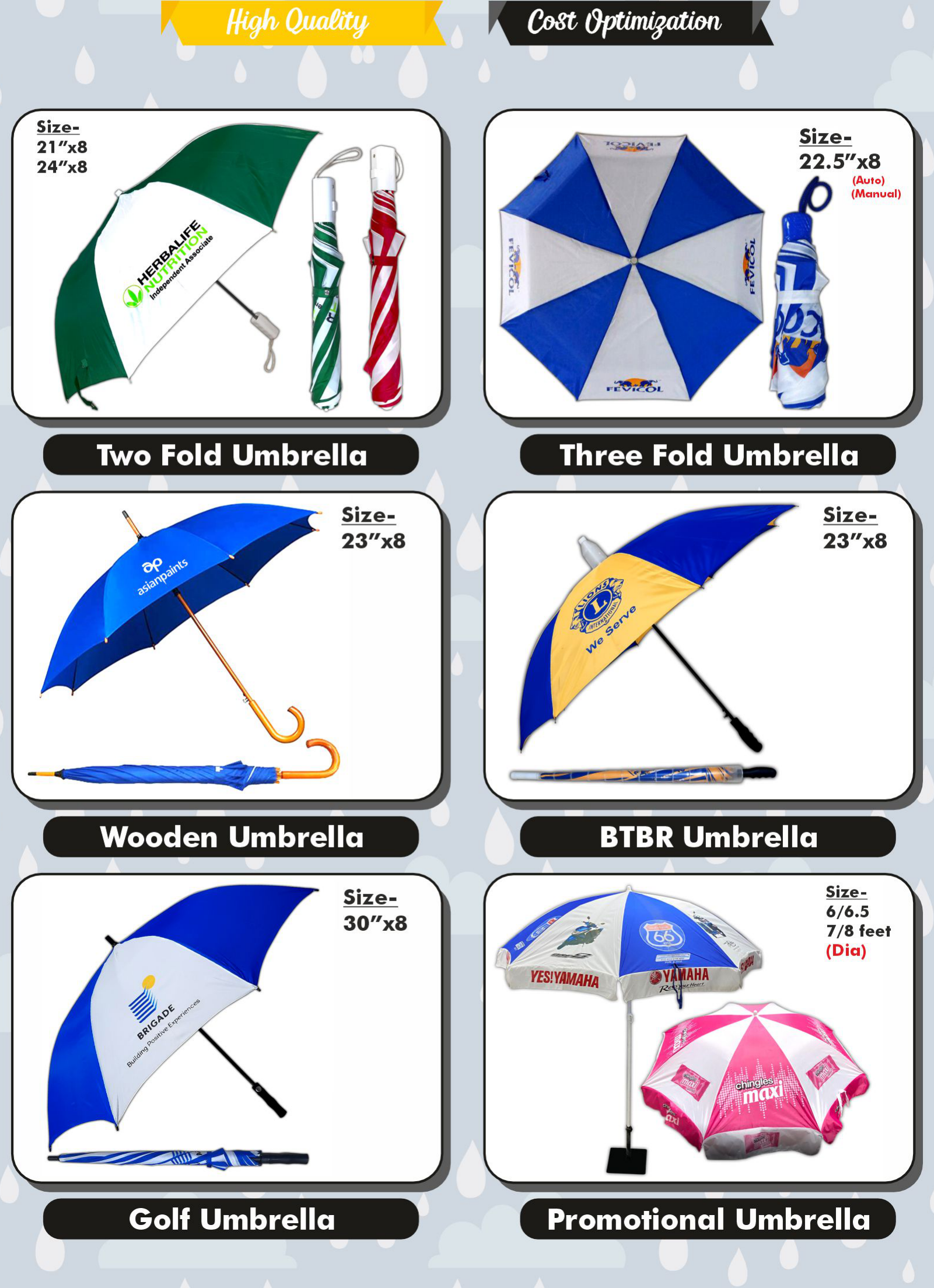 A variety of promotional umbrellas designed for branding and events. Available in different sizes and styles, these umbrellas offer practical protection from the elements while showcasing your company's logo. Ideal for corporate gifts, event giveaways, or outdoor promotions.