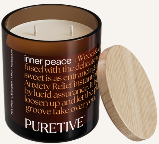 Experience tranquility with the Puretive Inner Peace scented candle. This candle is infused with a blend of wood, rosemary, mint, and lavender notes, designed to promote anxiety relief and a sense of calm. The amber glass jar and natural wooden lid add a touch of sophistication to any space.