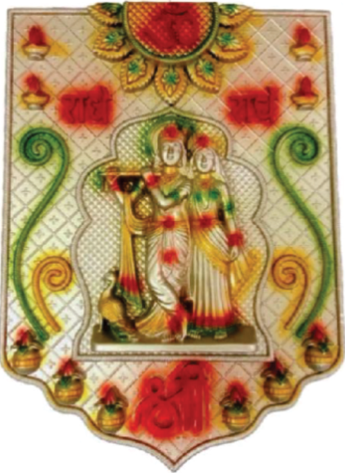 A beautiful wall frame featuring Radha Krishna, crafted with a golden and copper finish. This piece is designed to add a divine and artistic touch to your home or office space. The frame size is 12" x 16".