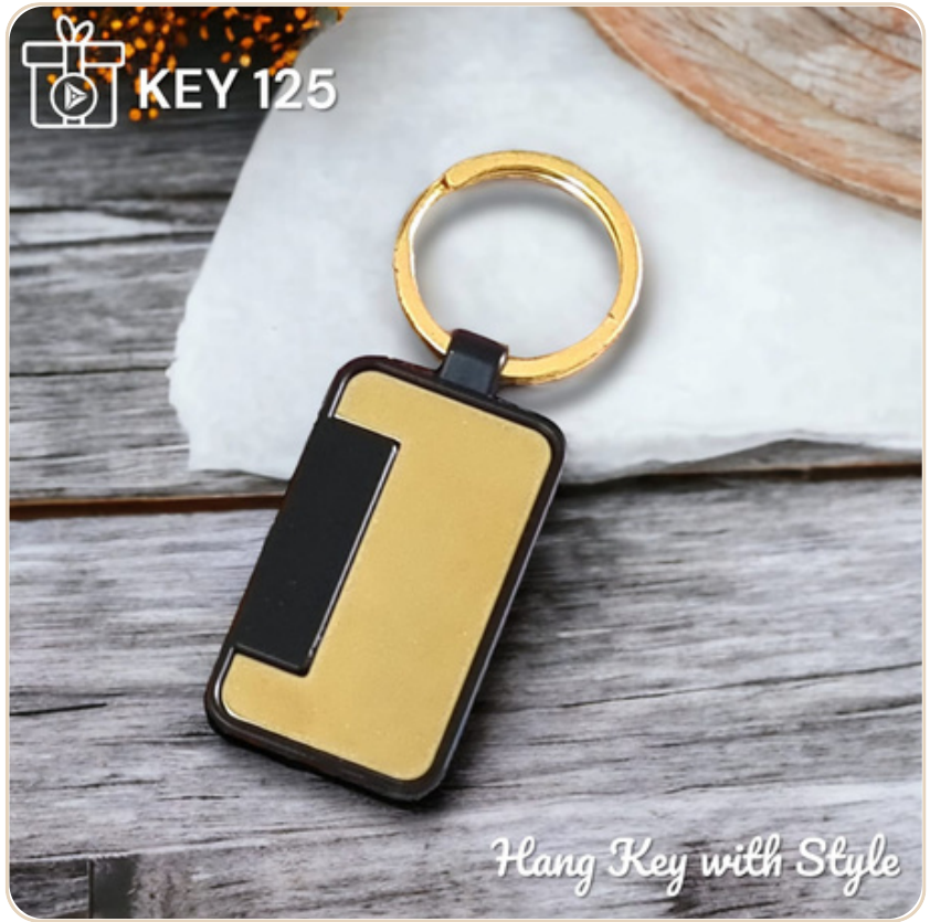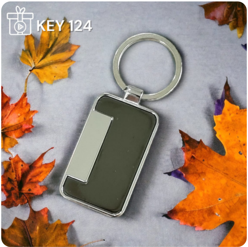 This stylish rectangular keychain features a durable metal construction with a sleek, dark-colored insert and a contrasting silver panel. Its modern design makes it a practical and attractive accessory for everyday use.