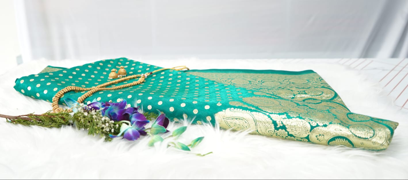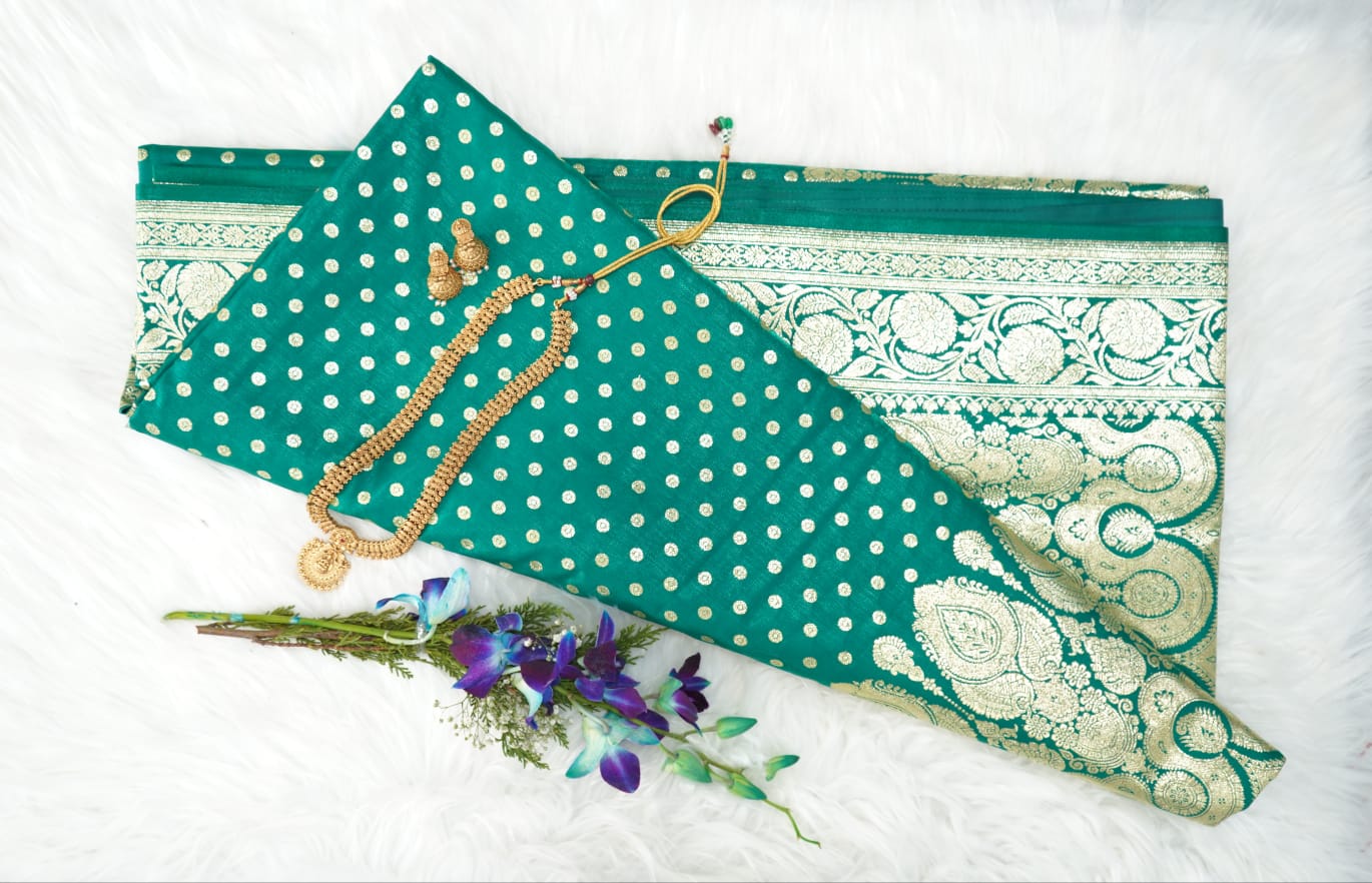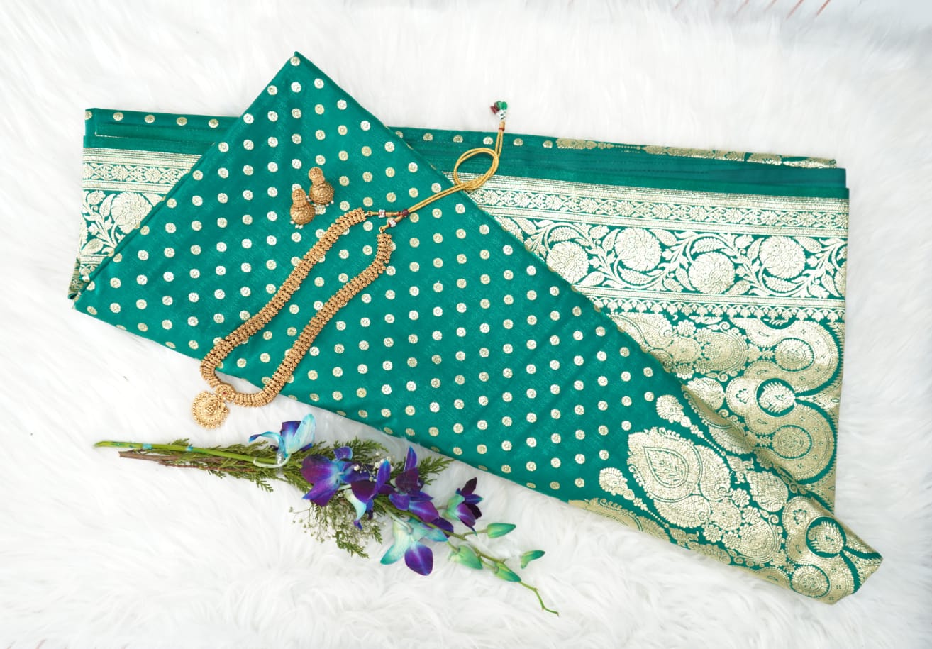 Step into an aura of timeless elegance with this sumptuous Banarasi Silk saree in a deep emerald-green shade. The body is adorned with evenly spaced golden buttis that catch the light with every sway, while the broad border and pallu showcase classic Banarasi brocade—floral vines, paisleys, and medallion motifs woven in lustrous zari. The rich contrast between the jewel-tone green and gleaming gold makes this drape a standout for weddings, festive gatherings, or any occasion where you wish to leave a lasting impression.