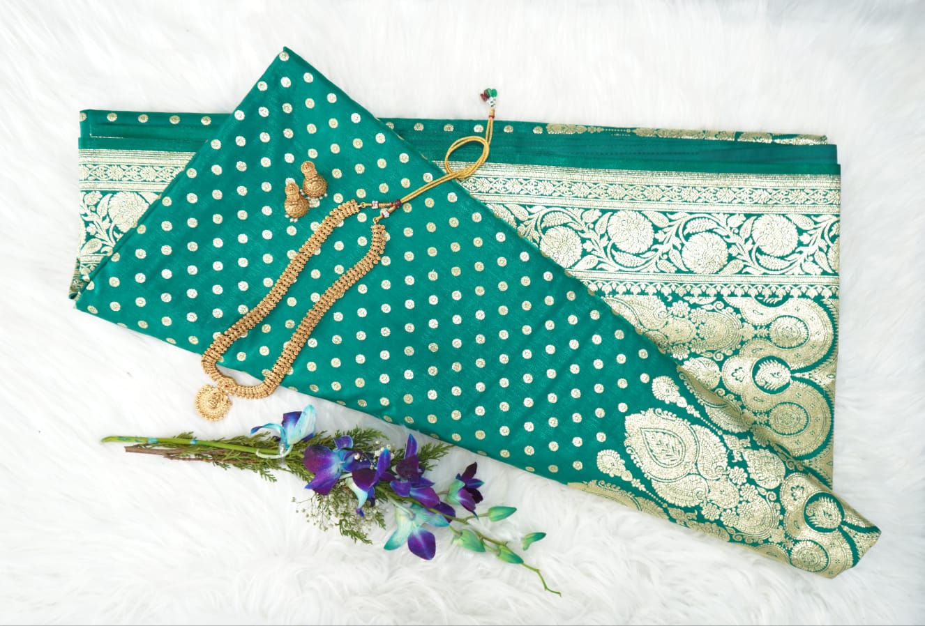 Regal Emerald Banarasi Silk Saree with Golden Buttis & Intricate Brocade Border