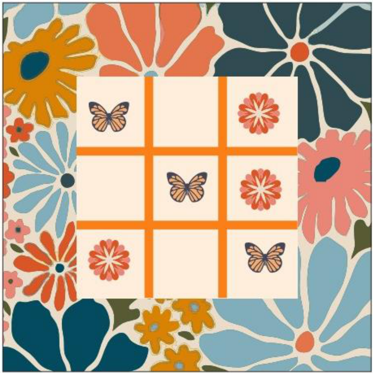 This retro-inspired tic-tac-toe game board features a vibrant floral pattern with charming butterfly and flower game pieces. It's a fun and decorative addition to any living space, perfect for casual play and adding a touch of vintage flair.